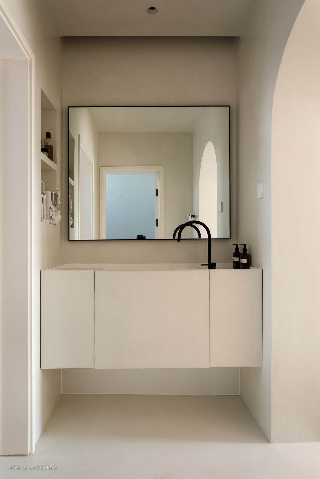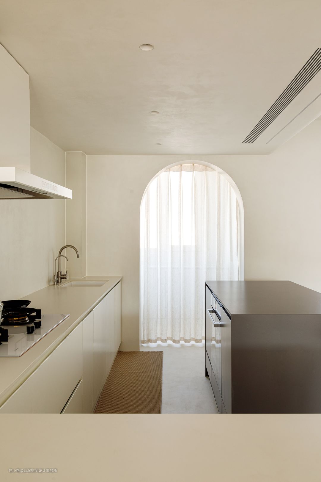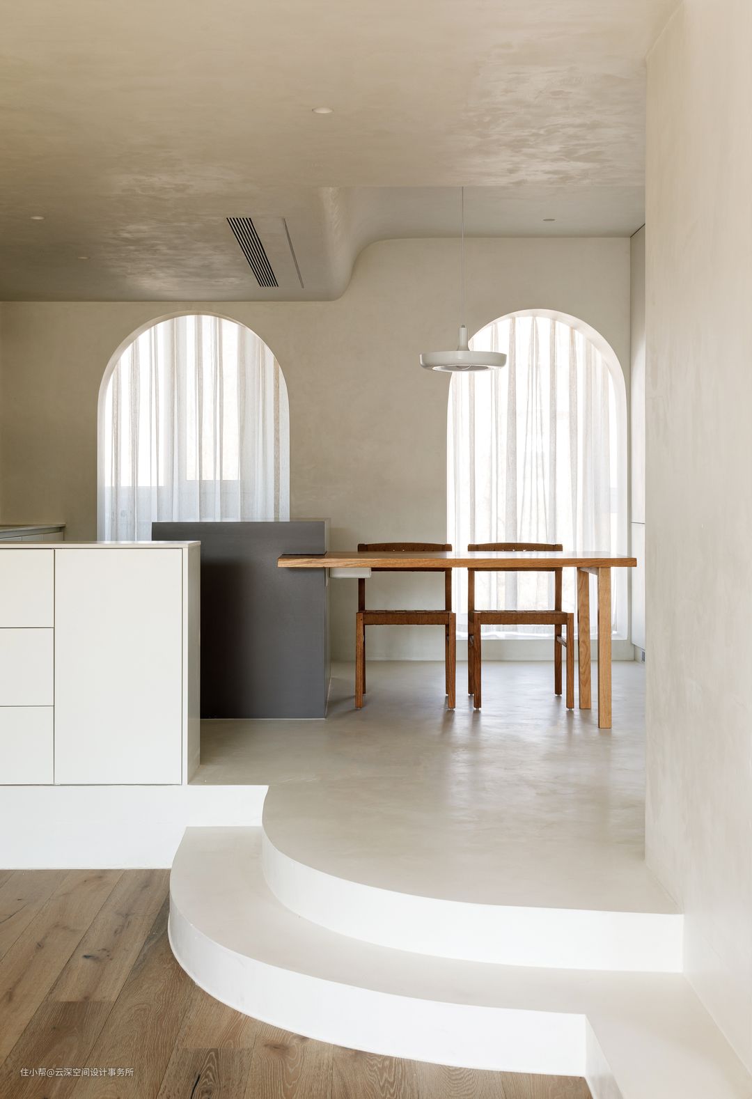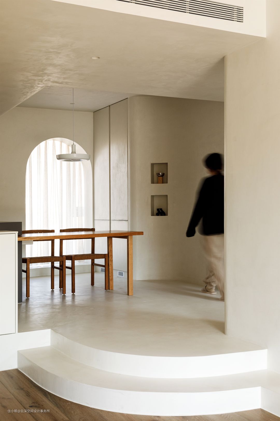 #侘寂风 #LDK一体化 #微水泥 #弧形造型 #中央空调 #壁龛 #软装 #中岛台 #开放式厨房
