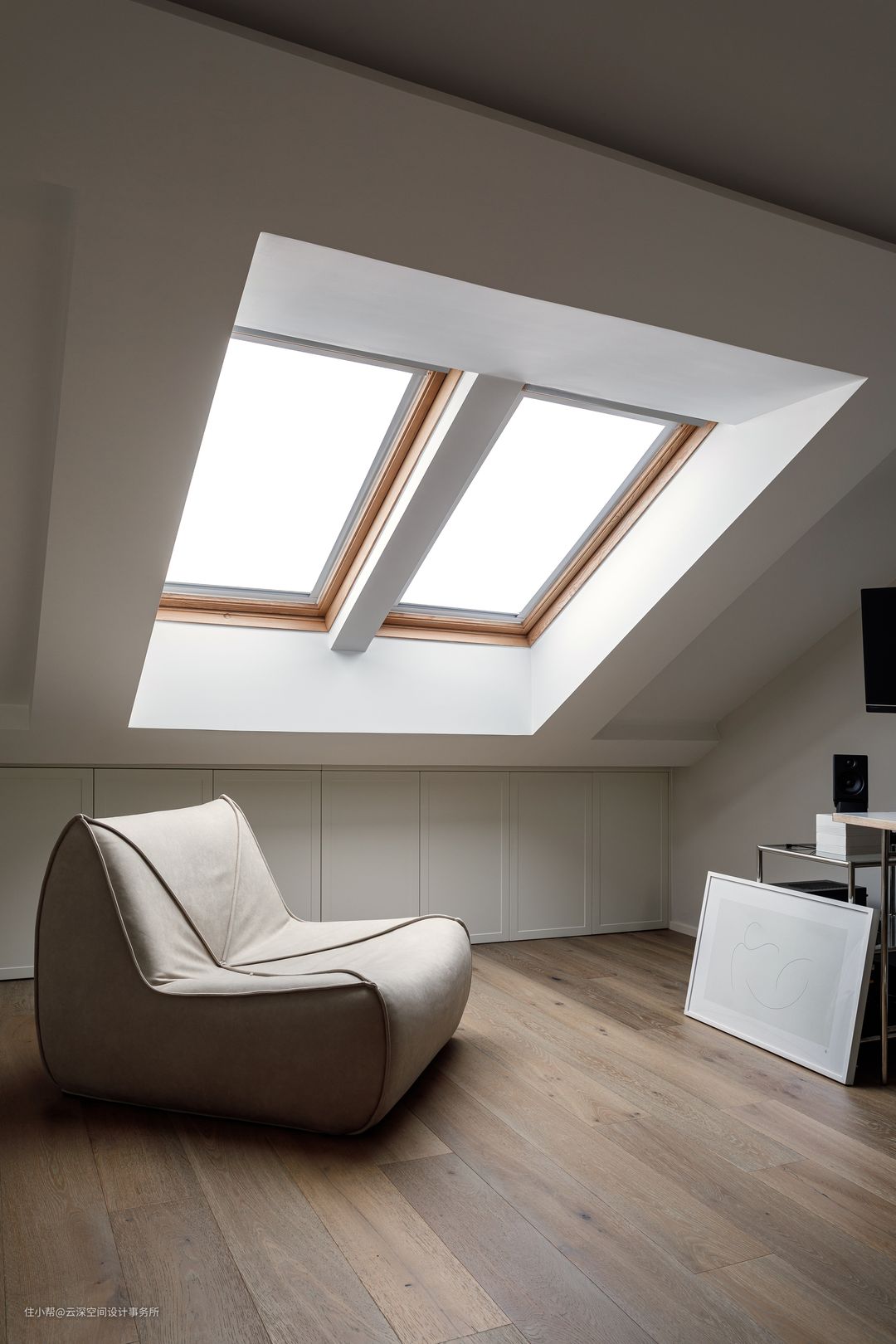 二楼有两间带天窗的屋子,一间作为书房,一间作为独立浴室;书房利用天窗斜角,我们定制了一组矮柜,增加了书房的储物空间;一张办公桌、一个沙发,晴空万里的夜晚坐在沙发上望着星空,享受独有的快乐; #侘寂风 #书房 #天窗