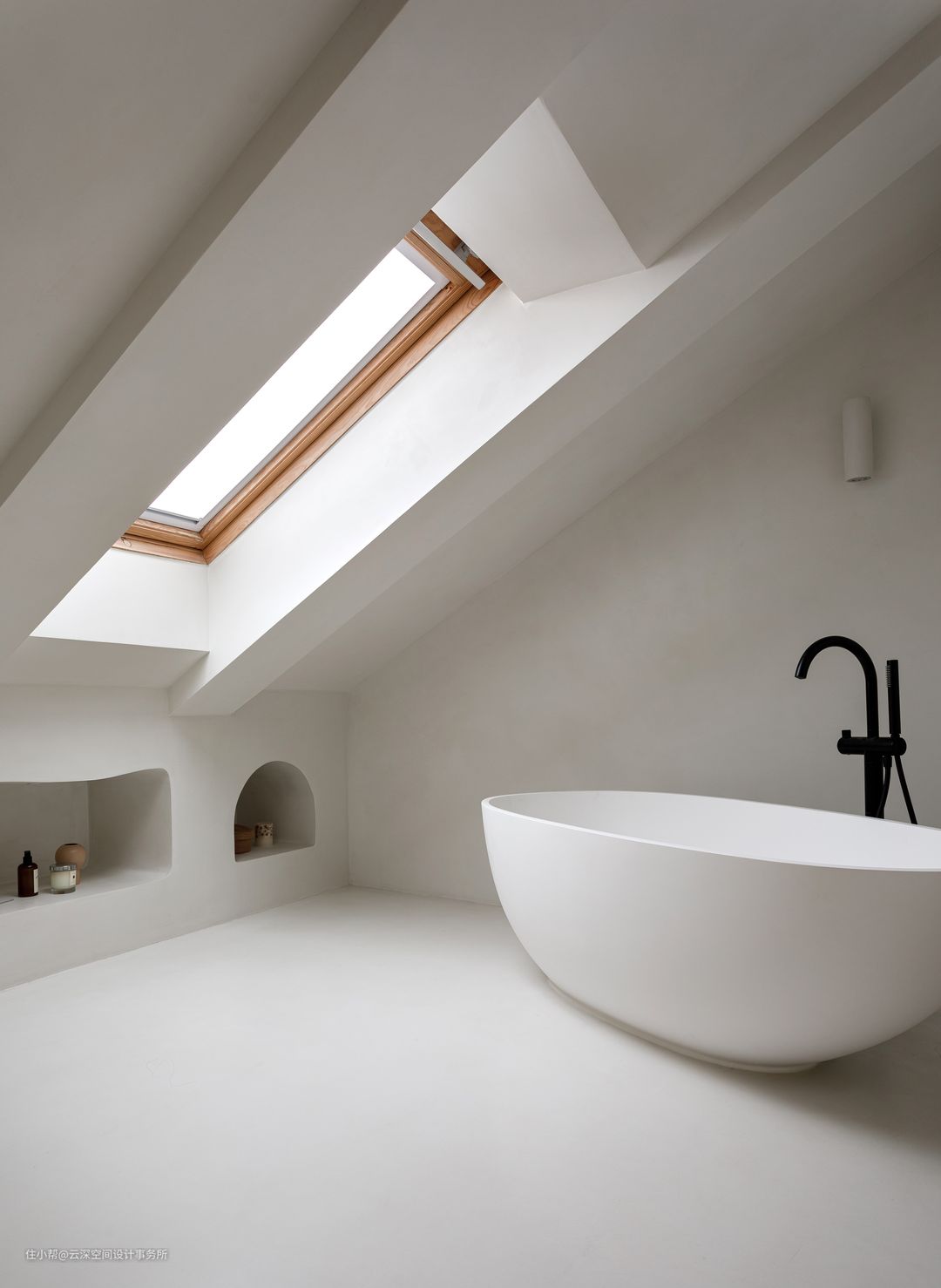 另一间,我们根据业主需求,规划为独立SPA区,靠近天窗一侧墙面壁龛造型,便于放置香氛、精油...试想一下泡在浴缸里,望着星空,舒适惬意; #侘寂风 #微水泥 #浴室 #天窗 #壁龛