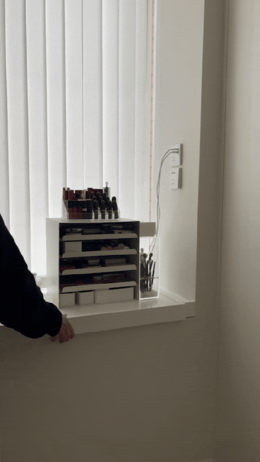 我们利用原始户型飘窗台,设计了一个可抽拉式飘窗台,作为梳妆台;使用时将飘窗台拉出满足使用; #现代简约风 #衣帽间 #定制通顶衣柜 #次净衣区 #飘窗台 #香格里拉帘 #竖百叶帘 #木地板