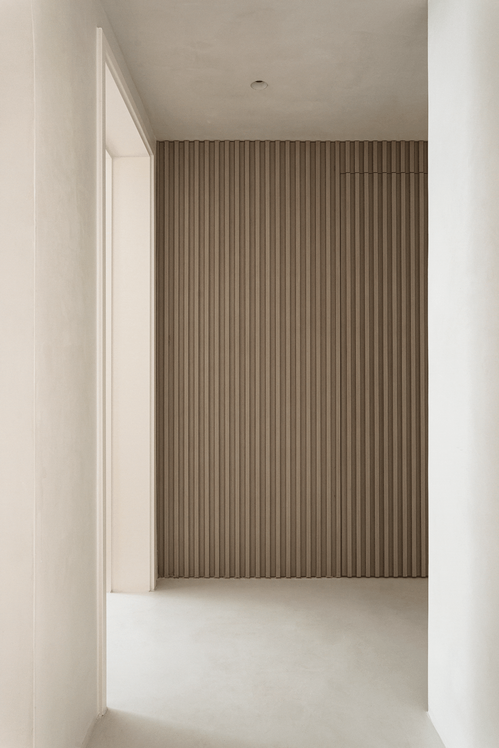 移步至走廊尽头,木格栅造型背后为独立家政间,隐形门的设计保持了空间的完整性;质朴的木格栅让拉长竖向空间的视觉感; #侘寂风 #木格栅 #隐形门 #家政间 #洗衣机 #烘干机