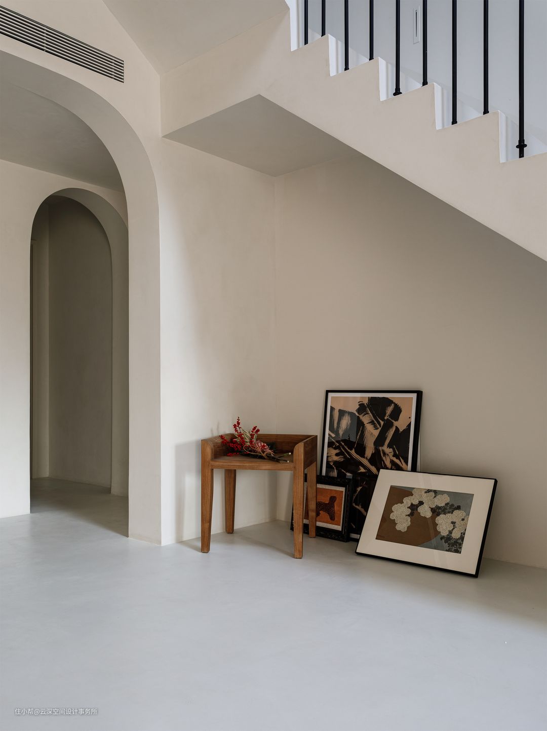 改造后,空间层次高低错落,弧形贯通;整体空间通透流畅;LDK一体式的开放空间缩短动线,增强各空间的互动性; 楼梯下的一角,几幅画、一把温润的木椅、一束干花...侘寂中流露的岁月美感; #侘寂风 #LDK一体化 #微水泥 #弧形造型 #中央空调 #壁龛 #软装 #装饰画 #干枝