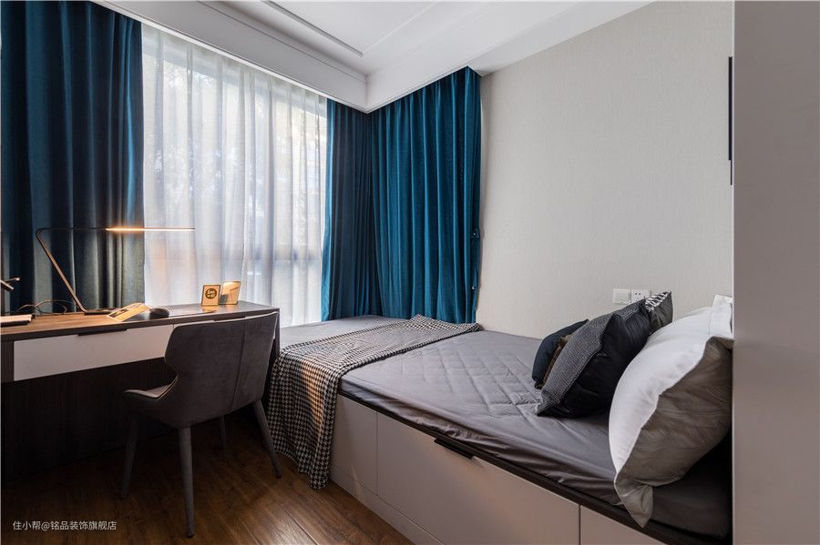 床体、床品和窗帘都选用了不同饱和的灰色系,更简约百搭。床头做了菱格造型,靠着会舒服些。