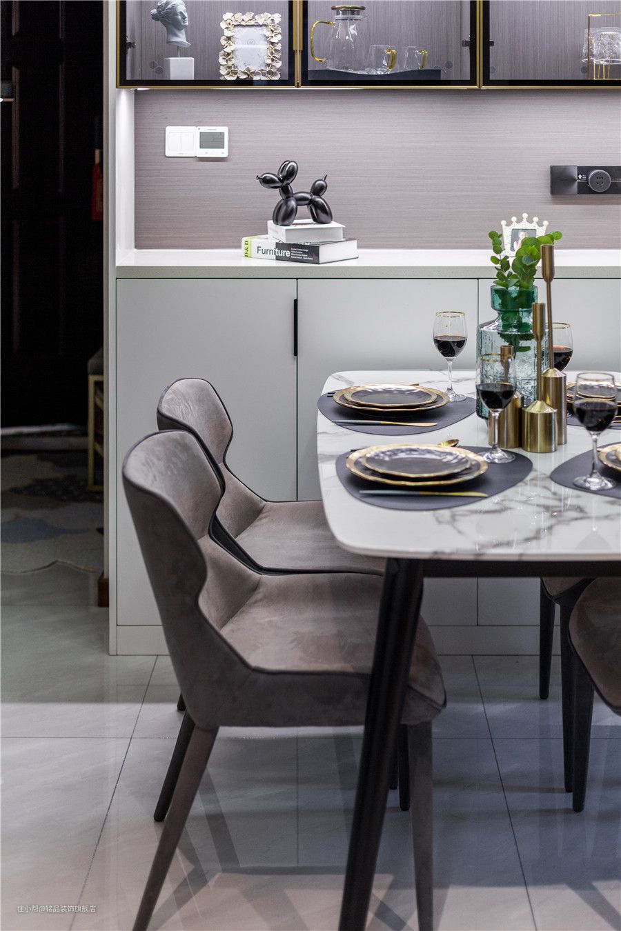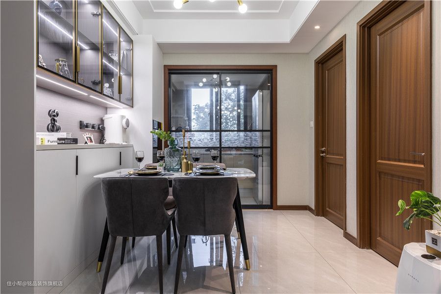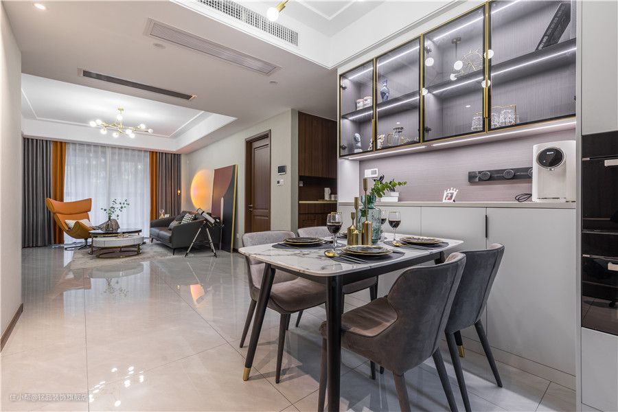 原本暗沉的客餐厅地板都用了灰色亮面地砖,提升了整个空间的明亮度,墙面也延续灰色系,保持大气的空间基调。