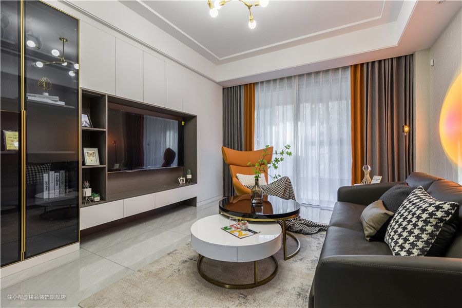 客厅几乎是不同的灰组成,但是毕竟客厅是全家人相聚聊天的场合,不希望太冷太暗,在窗帘、单人椅和灯中都加入橙色系,让灰中带点暖。