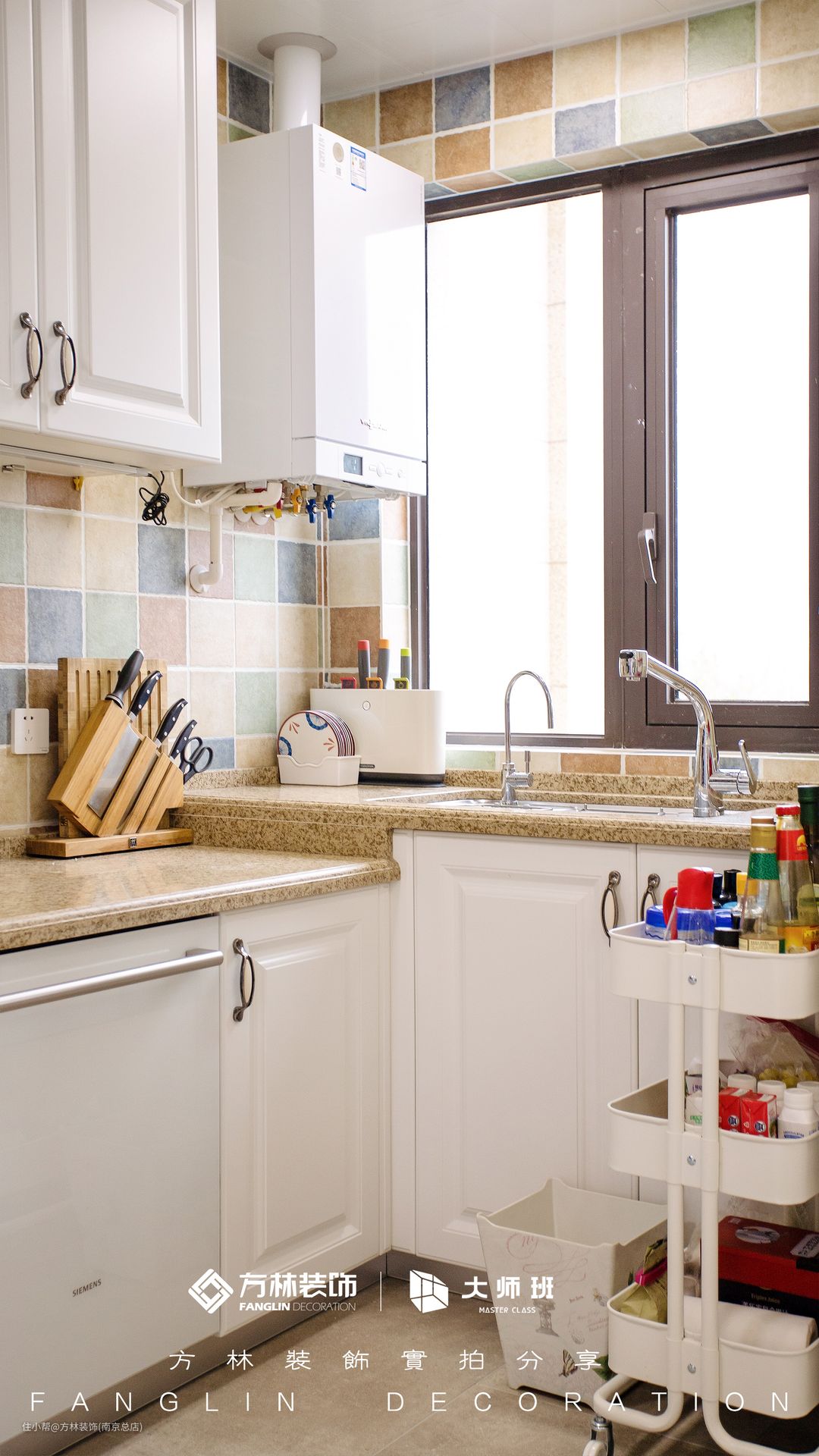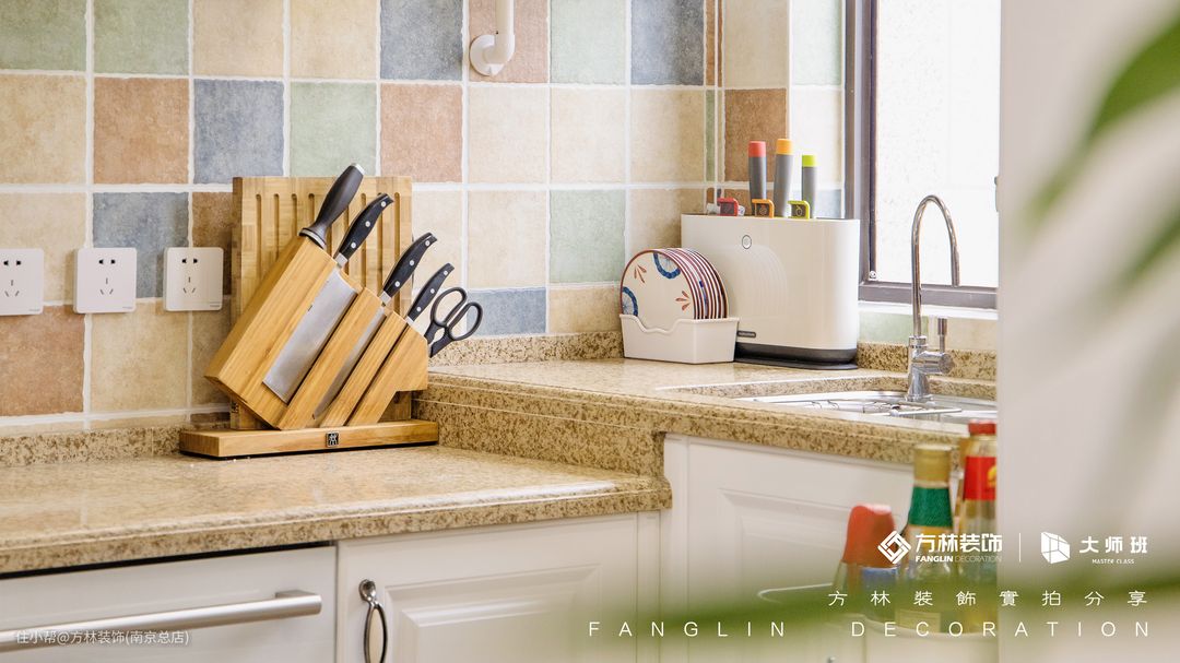 厨房做了L型的操作台,因为方便女主做饭,所以设计师为女主贴心的做了高低台的设计,在一侧还做了洗碗机的设计,在饭后如果不想刷碗就可以放进洗碗机。五彩斑斓的墙砖增加了空间的活力,给人带来了一种复古的感觉。