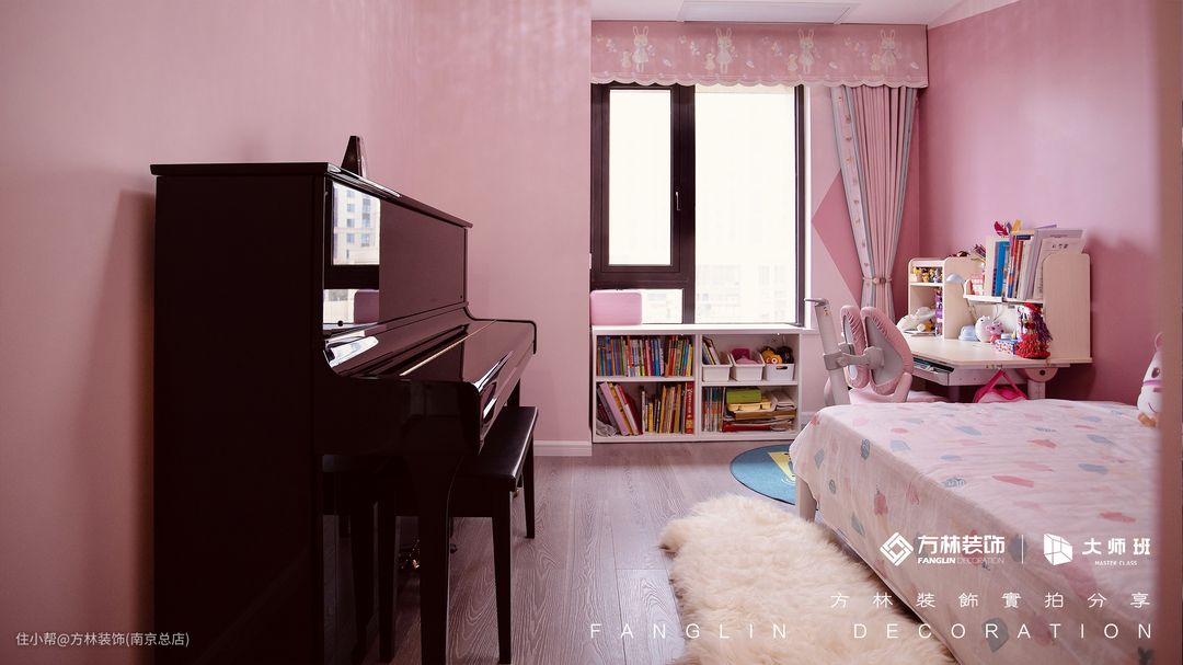 因为户主有一个非常可爱的女儿,在沟通中得知她喜欢粉色的卧室,所以在乳胶漆、床品、家具等等上设计师都为她贴心的选择了粉色。因为女孩现在在上小学路,所以在床的右侧放了学习桌可以方便放学后写作业。女孩在每周末还有钢琴课,女孩的妈妈就为她买了个钢琴还方便在家练琴,把钢琴放在床的对面也不影响正常的出入。