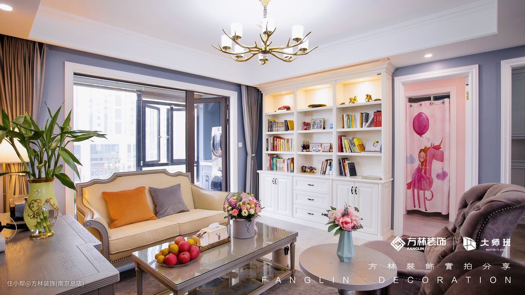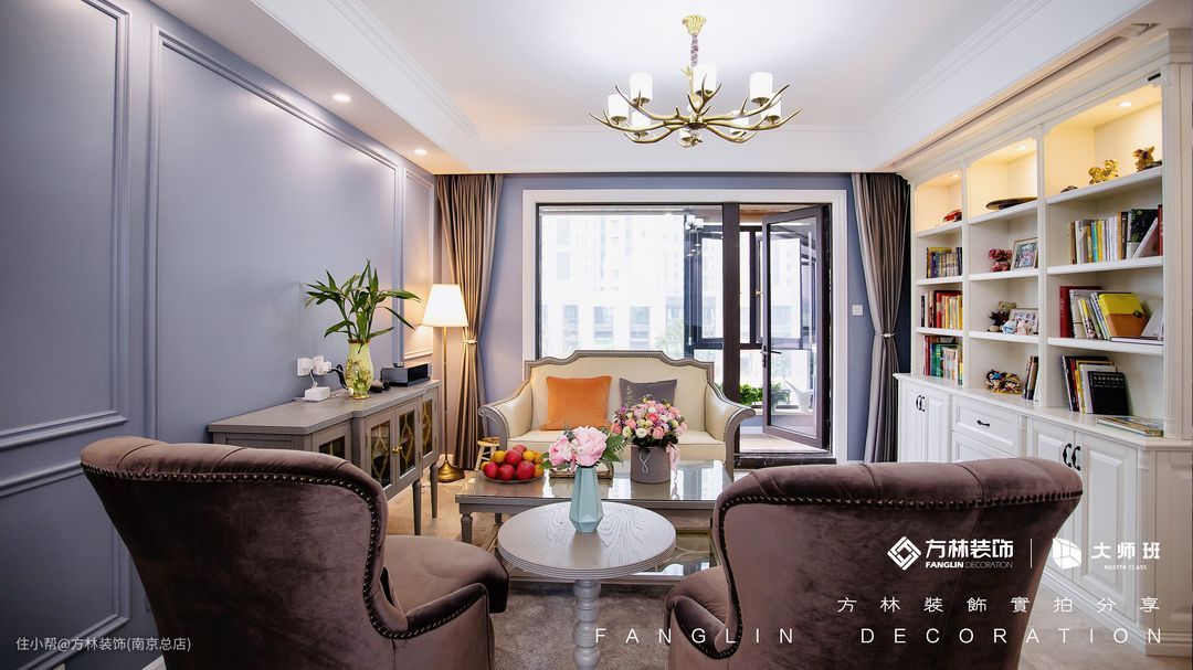 客厅整体色彩层次丰富,但遵循统一呼应,沙发背景墙选用莫兰迪色。因为户主不喜欢电视的设计,所以我们将那面墙做了整排书柜,上方镂空用来存放书籍,下方封闭式可以存放自己当季不需要的物品和和家里的囤货,把手也是精选造型。主吊灯与餐吊灯采用相同款式,并且也和角落的台灯相呼应,共同营造细腻的灯光范围。