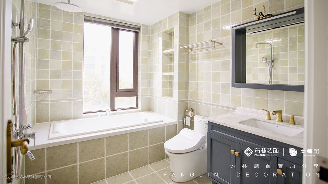 本案卫生间并没有做干湿分离的设计,但是也并不缺乏它的实用性,洗漱台和整个空间的颜色互相搭配。卫生间既做了淋浴区也做了沐浴区,因为户主想在一天的疲惫后能好好放松身体,所以设计师还为户主设计了浴缸,在浴缸的一侧还做了壁龛的设计。