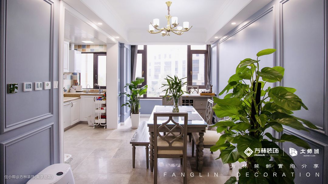 餐厅与客厅通长,在靠窗台处还做了岛台的设计,餐桌的材质,餐椅的材质还有岛台的材质相统一、协调。如果早餐不想在餐桌上吃的话还可以使用岛台,还方便打理。在桌子的两侧和桌子的上方还放了植物,为整个空间带来生机。