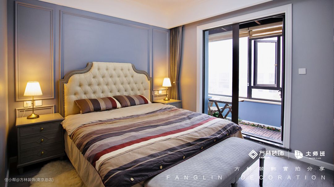 卧室是我们使用频繁最高的一个空间,它是我们主要的休息场所,所以卧室的装修也是非常重要的。在背景的选择上和客厅、餐厅相同,舒适、美观的卧室也可以让人心情更加愉悦、放松。因为户主不喜欢强度太高的灯,所以分别在两侧都做了床头柜的设计,床头柜的上方两侧分别放了户主喜欢的台灯。