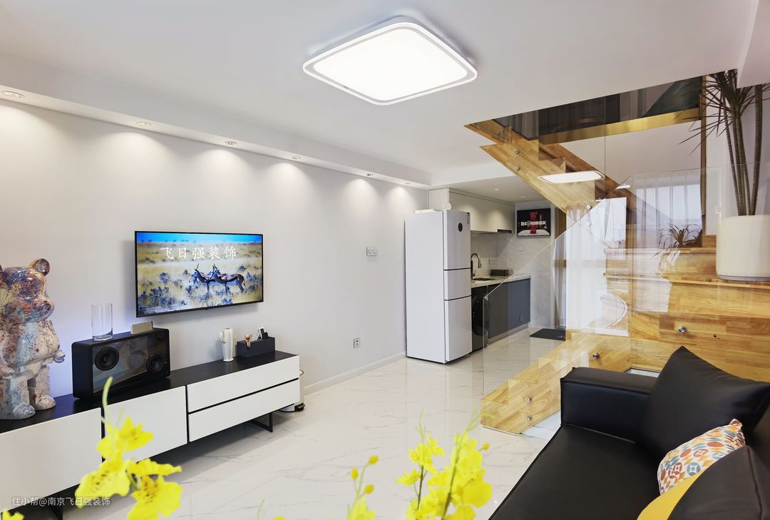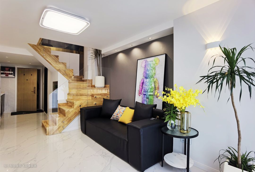 全屋最亮的就是网红楼梯,自带感应灯设计,通透玻璃扶手不仅让人感觉空间通透宽敞,更有一种时代亲切感。