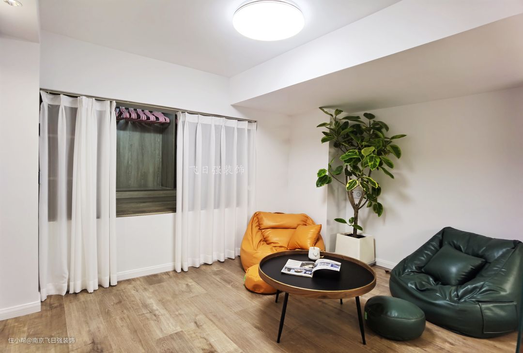 二楼内部空间敞开式休闲空间,地面全部通铺浅色地板,搭配一套懒人沙发很有感觉,闺蜜、情侣在这里一起畅谈小憩都非常温馨有感觉哦。