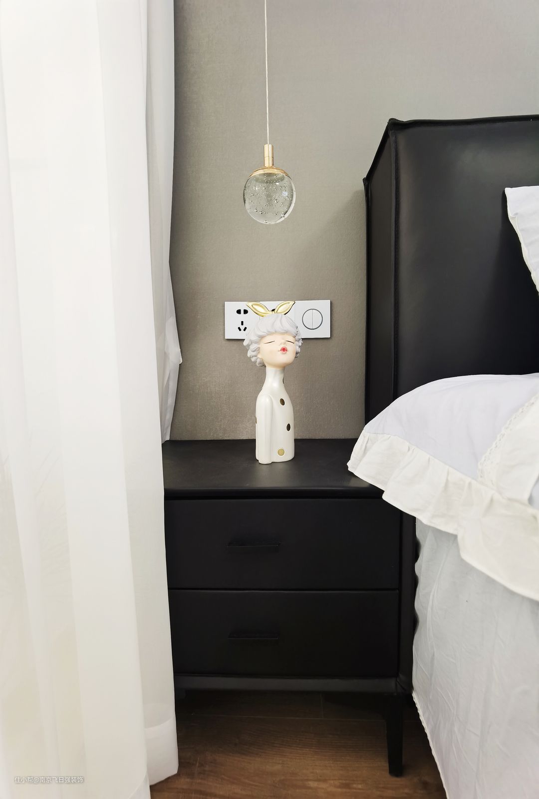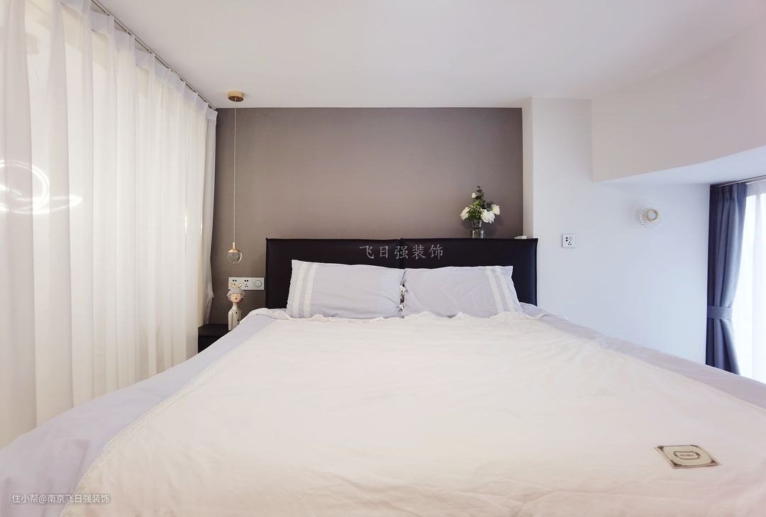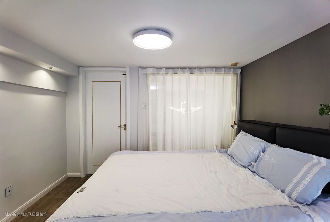 主卧室与客厅呼应,浅灰色床头背景墙,搭配黑色皮质床与床头柜,简单舒适。搭配纯白色床品,整个空间非常素净让人安静舒适。