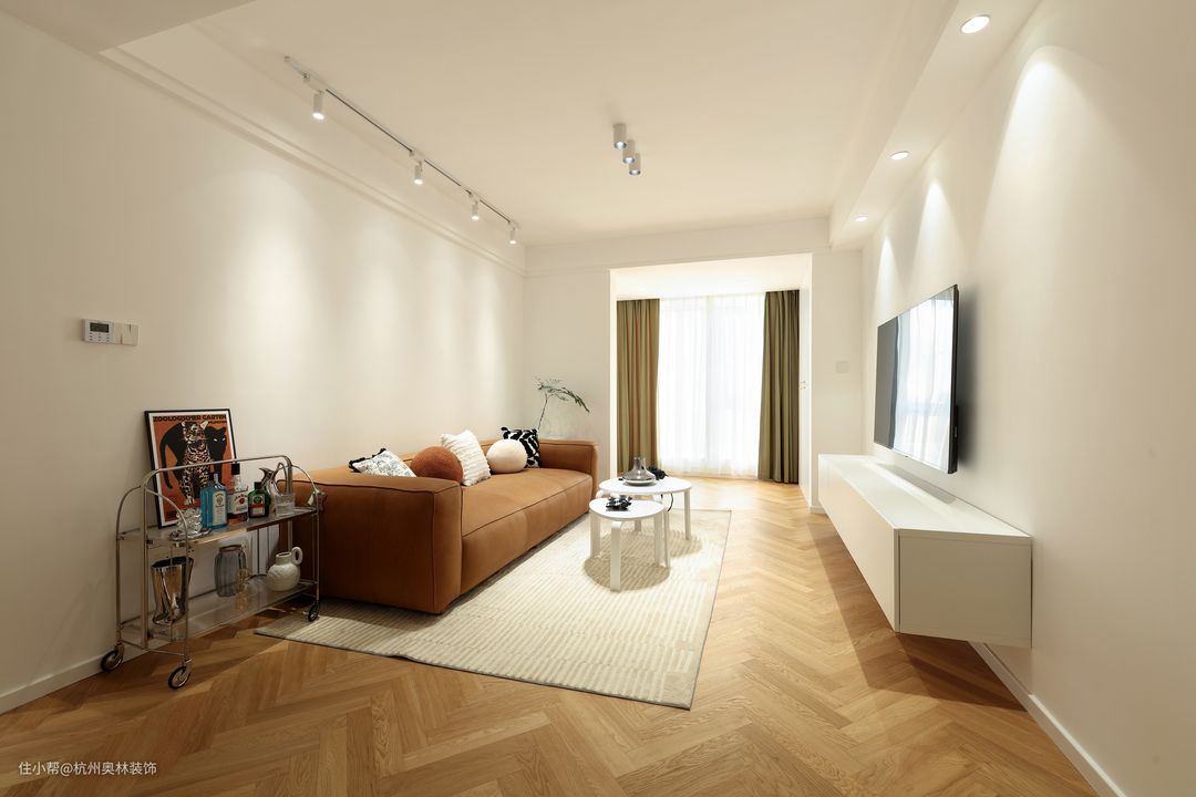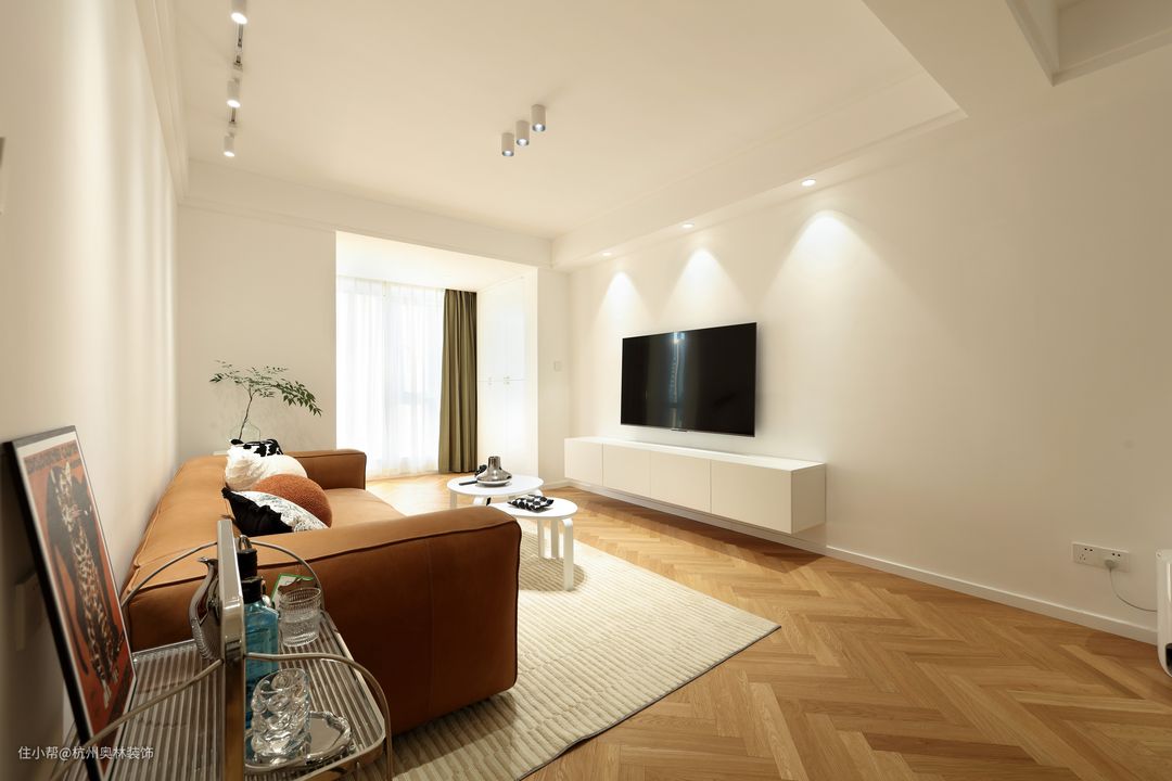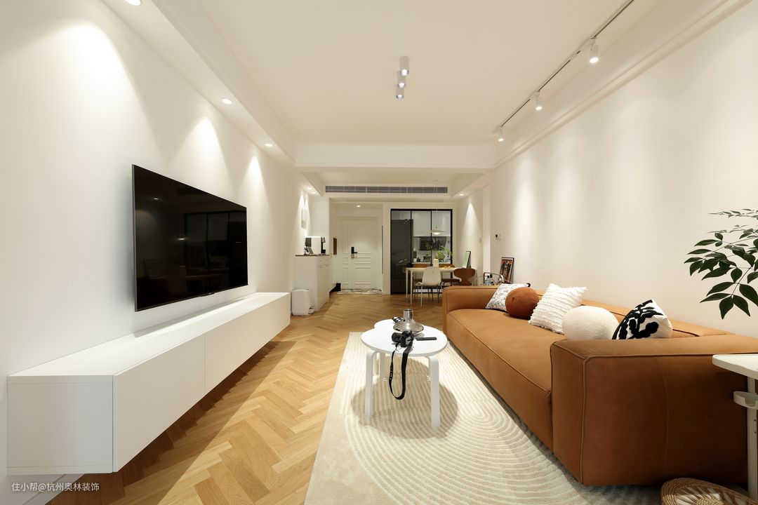 屋主是一位独居的小姐姐,喜欢简约日式风格,仔细认真。很喜欢研究灯光和软装搭配。整屋极大的减少了主灯的设计,运用筒灯与射灯相互托衬。整屋墙面以洁白为主,亮与黑的结合,视觉空间感上层次丰富,搭配上地板人字形铺贴,使空间感更强烈。