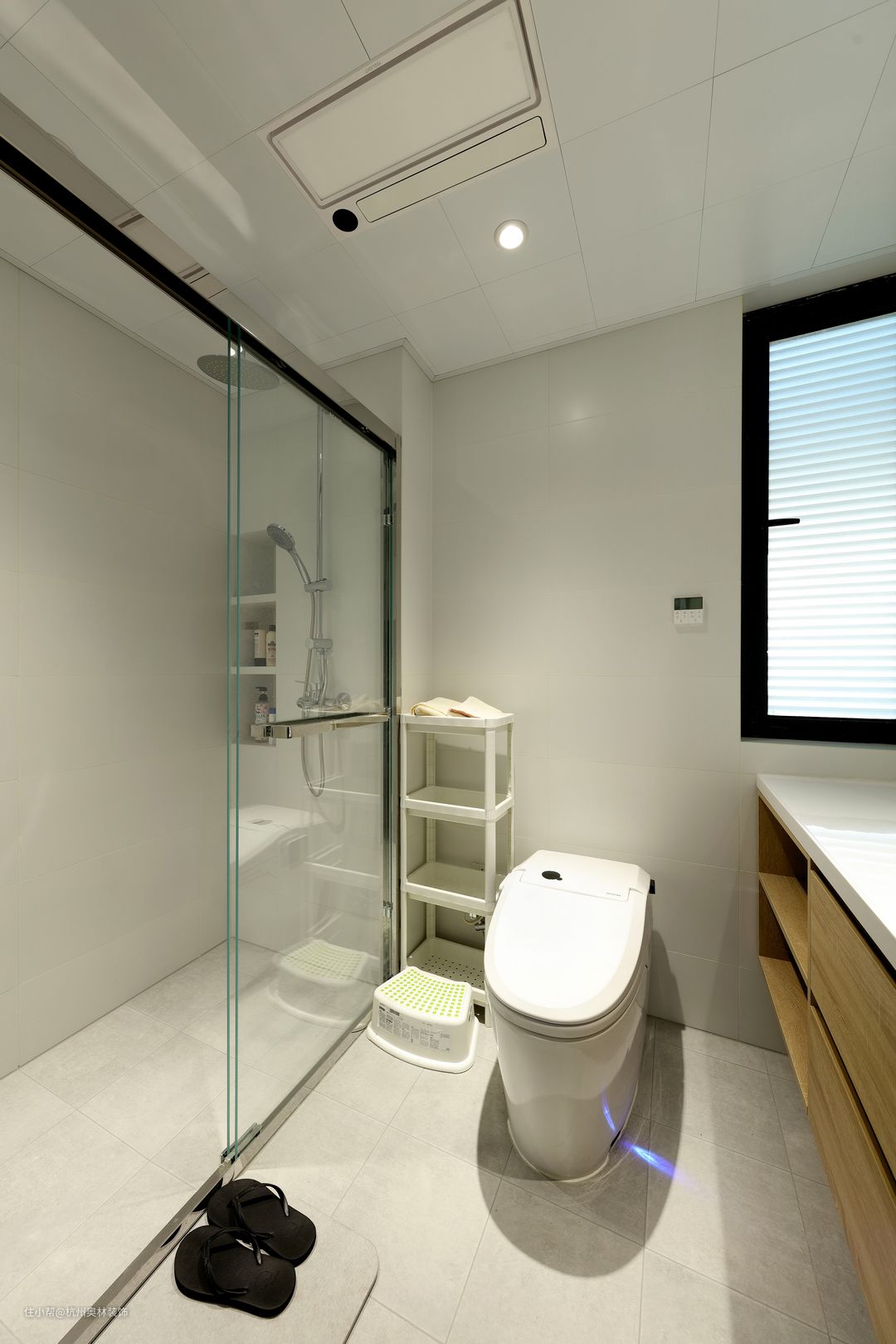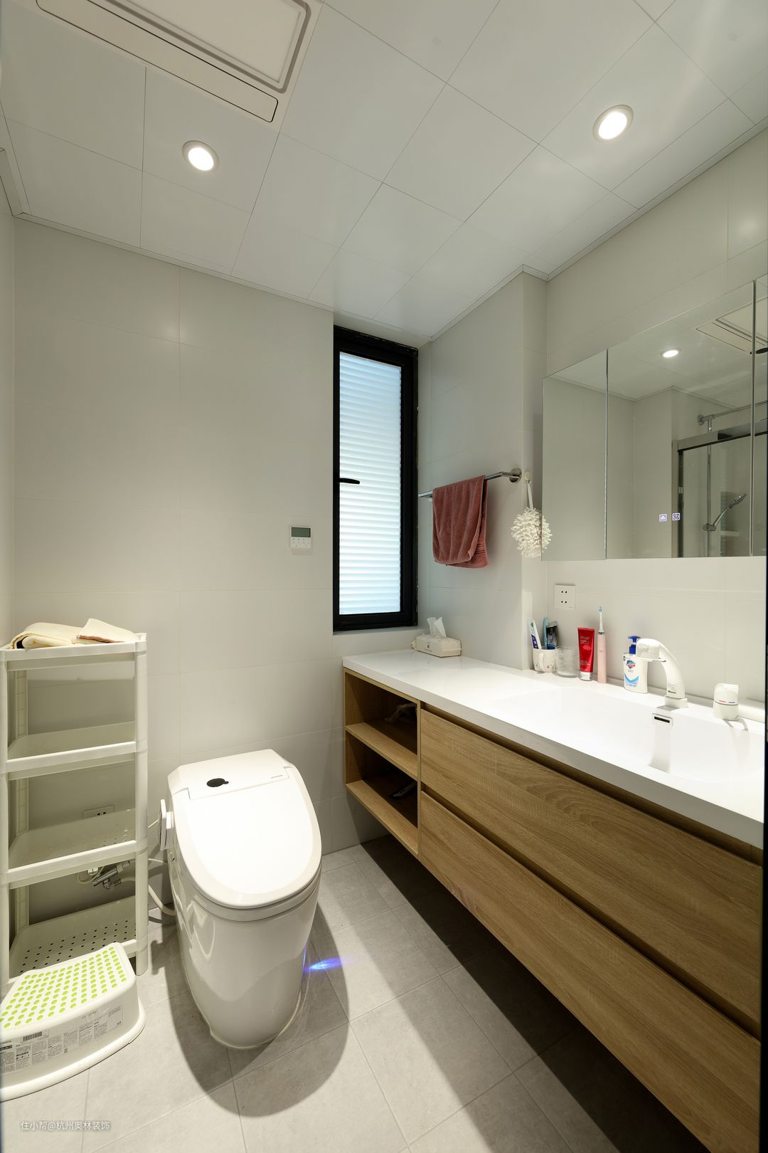 卫生间无主灯空间明亮,一扇小窗户搭配上长虹玻璃,保护隐私同时增加通风采光。一体式洗漱池颜值满满,还方便打理,智能浴室柜组合更贴近生活。