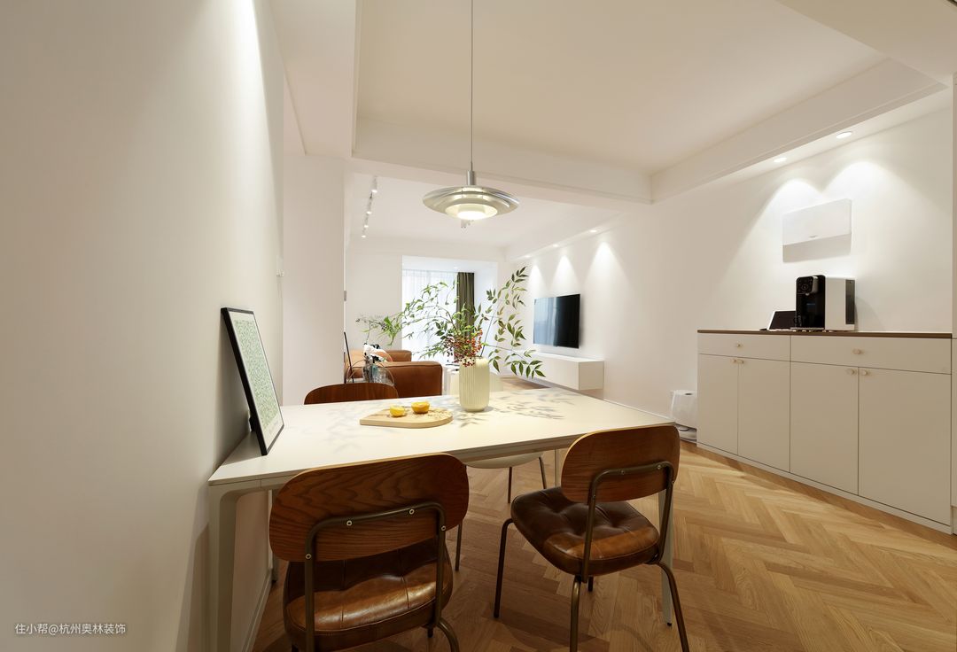 玄关柜延伸至餐厅,不仅有了餐边柜,在平面和色彩上还做到了和谐统一。