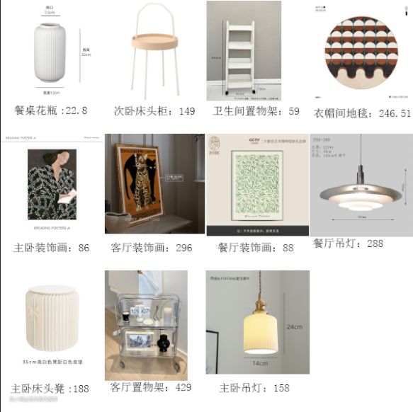 餐桌的花瓶和装饰画,客厅与卫生间的置物架,主卧与餐厅的装饰画,主卧和餐厅的吊灯,地毯,次卧床头置物架,主卧的纸质折叠凳。