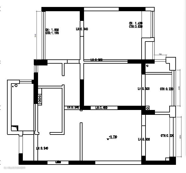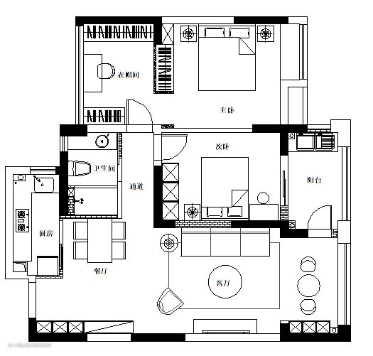 原始户型:1、没有餐厅,厨房从侧面进去,空间非常狭小。 2、墙面隔断多,空间流动性差。 3、卧室太小,衣柜收纳空间严重不足。