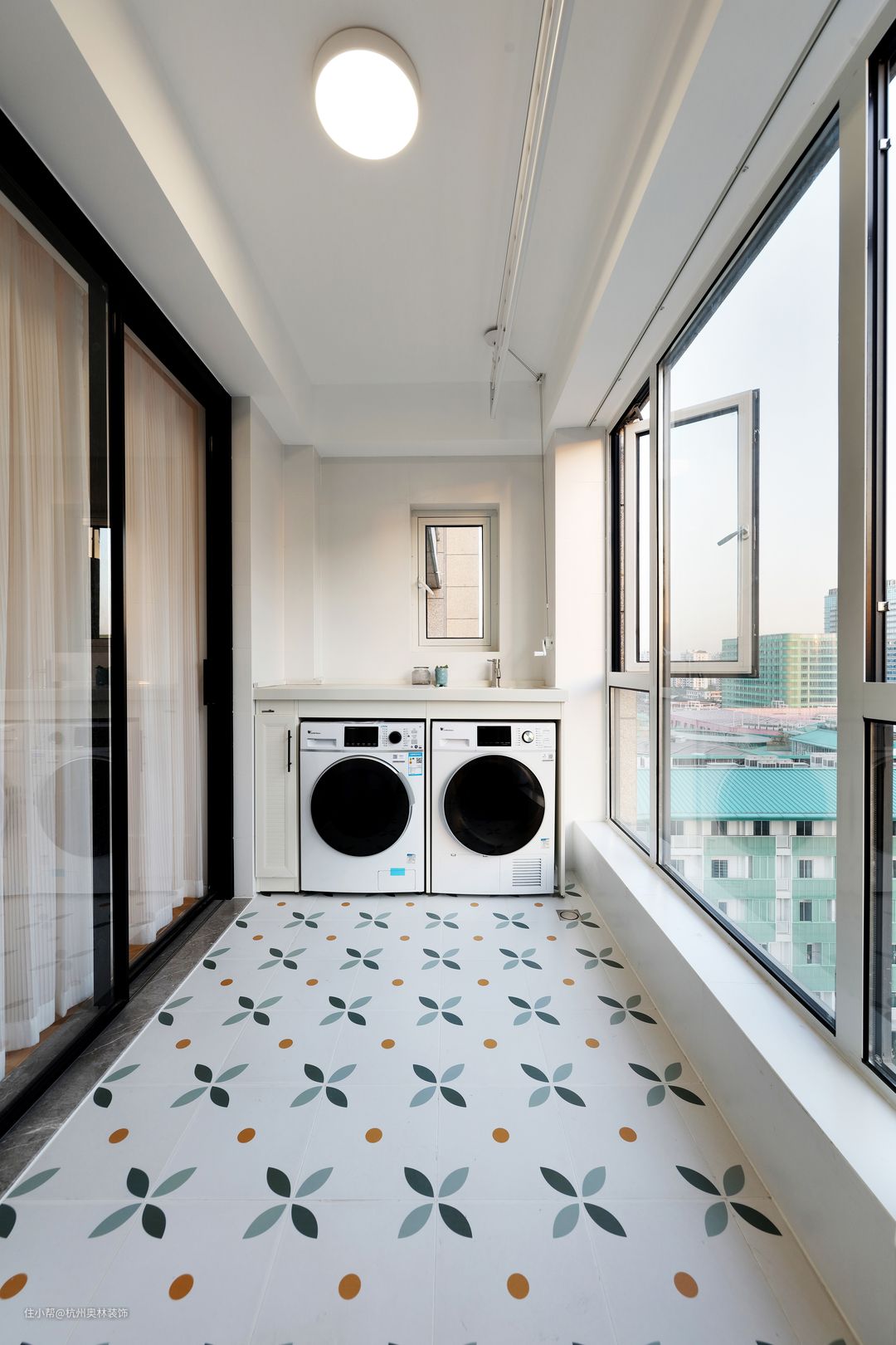 阳台本是一个天清气朗的地方,搭配上北欧小花砖,保留侧边窗户,取消洗衣柜,在洗衣机侧边留一点空间,做放洗衣用品的储放 。