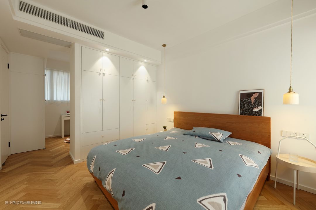 主卧把原二房改成套房,小房间直接变成衣帽间,卧室区干净清爽,衣帽间也简单有空间。