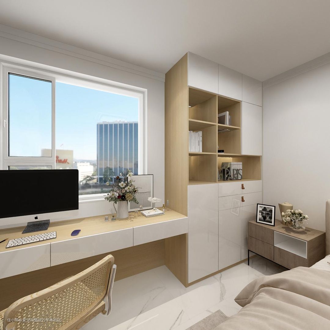 云朵床奶油色甜美风,让卧室变得轻盈柔软,桌柜一体原木家具配合藤编椅,清爽透气。