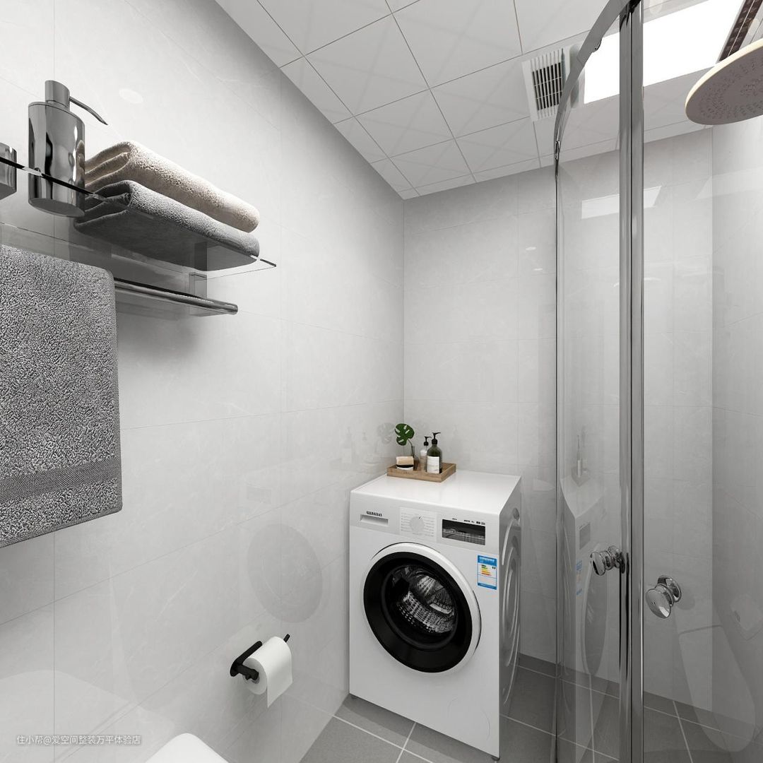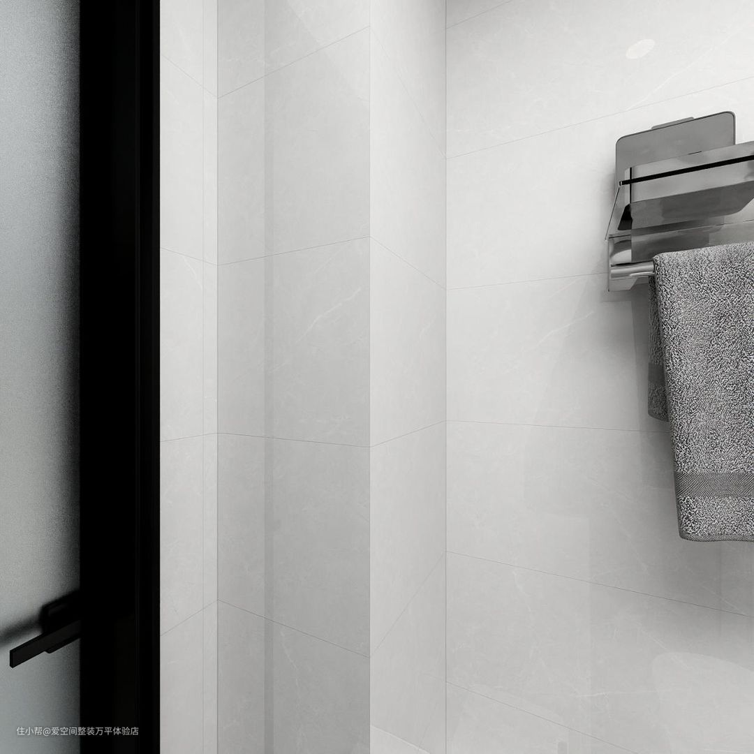 无缝白色大理石瓷砖光滑耐磨好打理,方型淋浴房抹边设计更安全,小浴室也能完美干湿分离。
