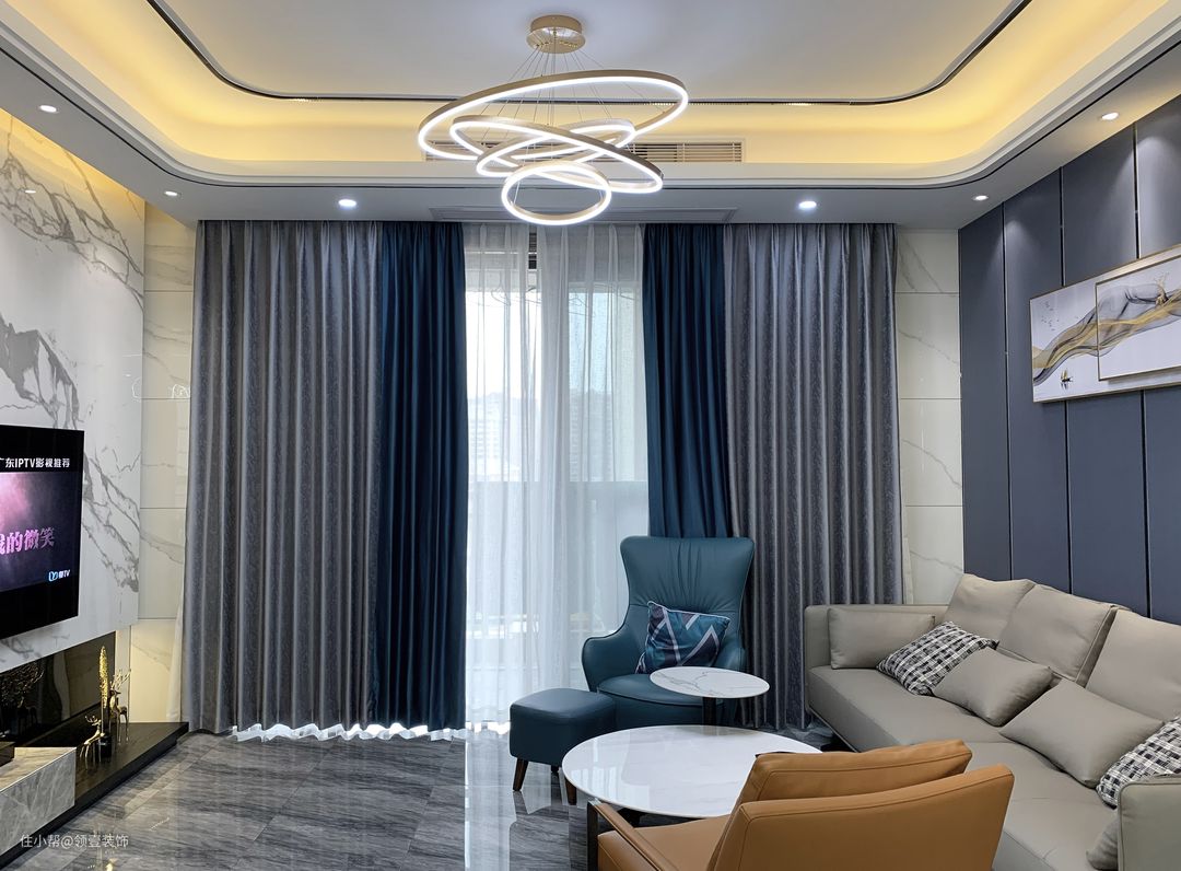 独户电梯,入门即客厅,没有玄关的过渡,鞋柜收纳可以完全放在门外。大理石电视背景墙,黛蓝色硬包沙发背景,蓝灰色地砖,灰色拼接孔雀蓝窗帘,深浅有序的蓝色,整体给人一种低奢的华丽。