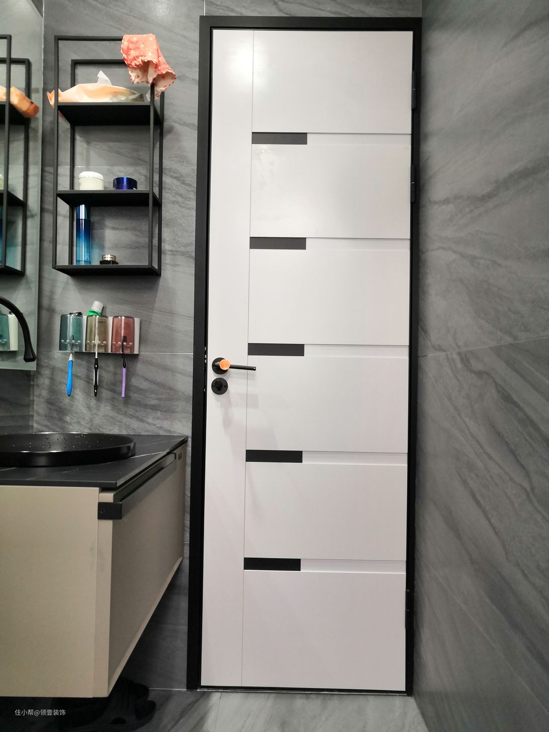 在选择深色系卫生间墙砖时,我们特意选择了略带纹路的墙砖。带点高级感。
