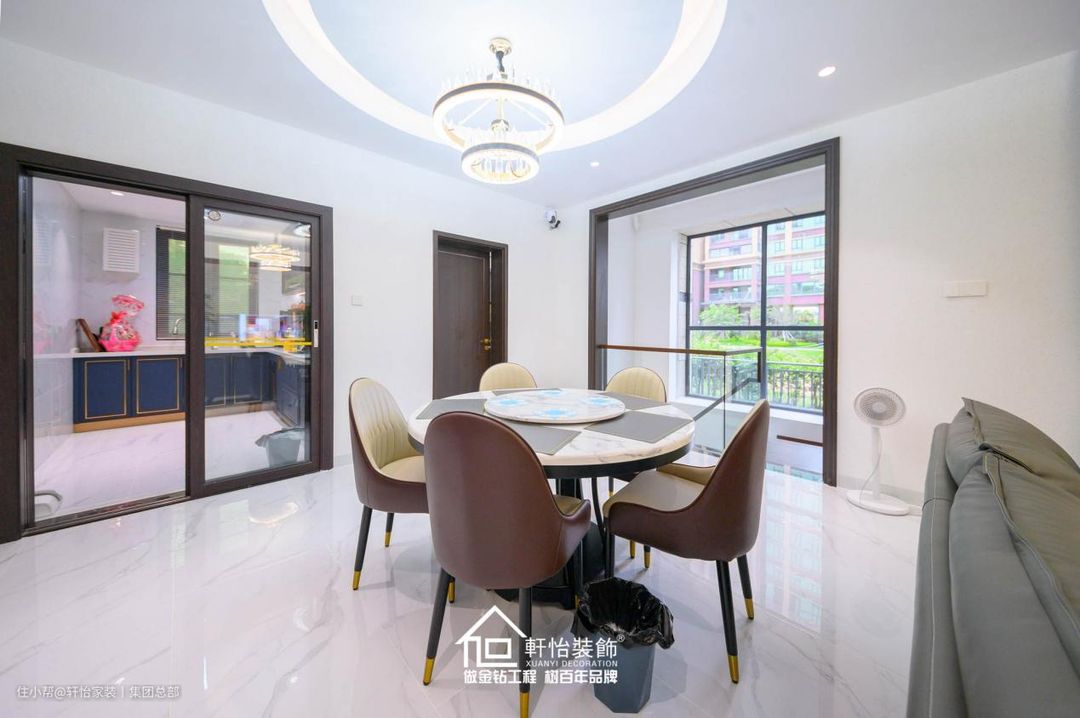 撞色皮质椅子搭配双层花纹岩质转动桌,提升了整个餐厅的高级感,转动桌子不仅贴合了屋主的多人用餐的便利体验,还体现了设计感,非常适合招待客人或人多的家庭,生活体验更加便捷。