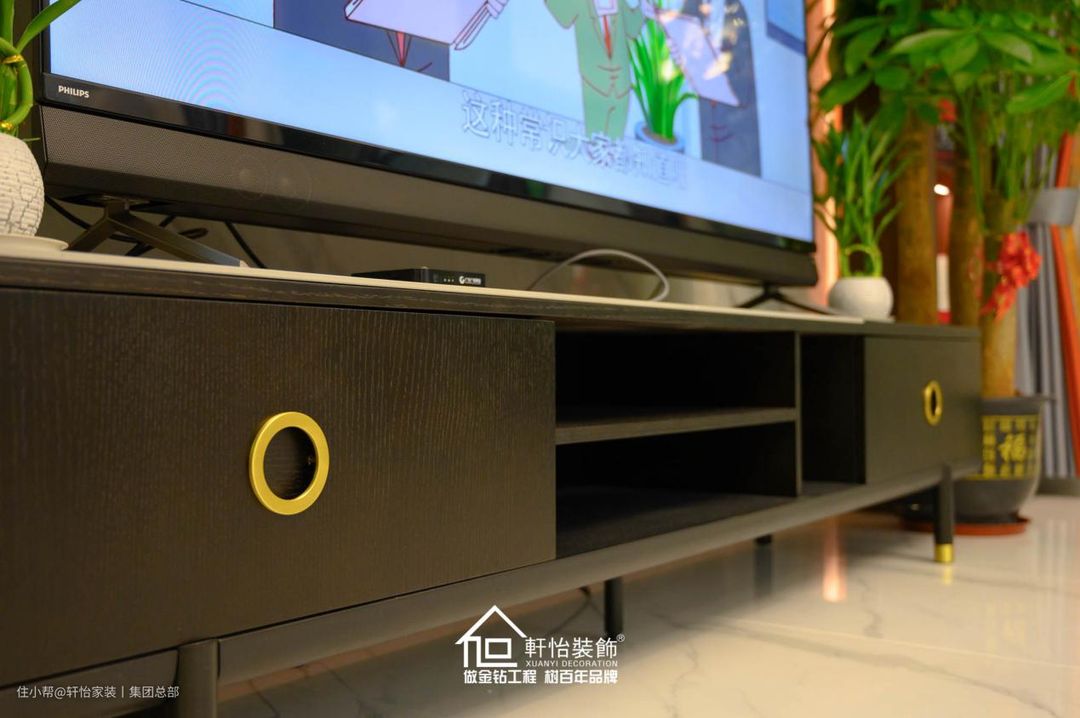 深灰色的木质电视柜使用抽拉设计、金属圈点亮,更显优雅与精致。旁边摆设两盆发财树作为空间色彩点缀,整体古韵味更为突出。