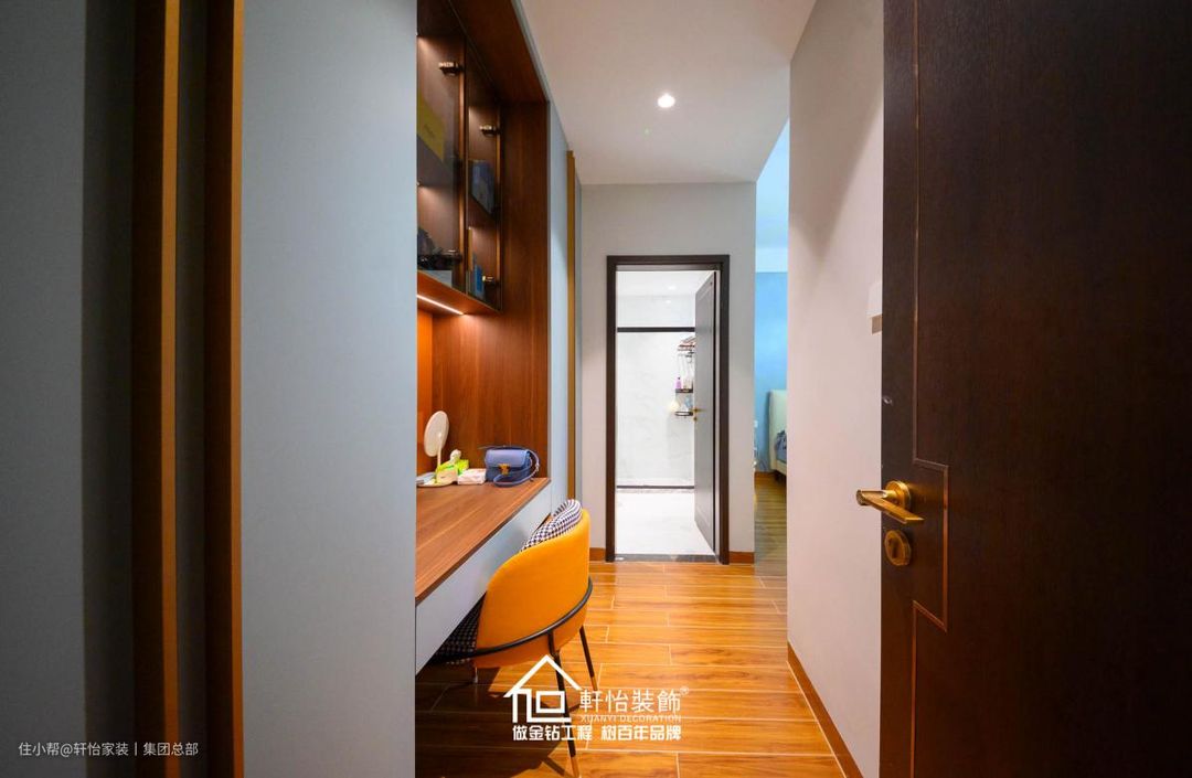 H型衣柜设计,让出的中空位作为女主人的梳妆台,柜体与墙面同色设计,减少视觉突兀感,更显轻盈。顶上墙面则是设计透明储物柜,放置化妆品、包包,展现生活的小美好。 整面到顶衣柜设计,衣柜拉手与空间拉伸尺寸恰到好处的吻合,再一次体现了设计师对空间尺寸的精准把握。