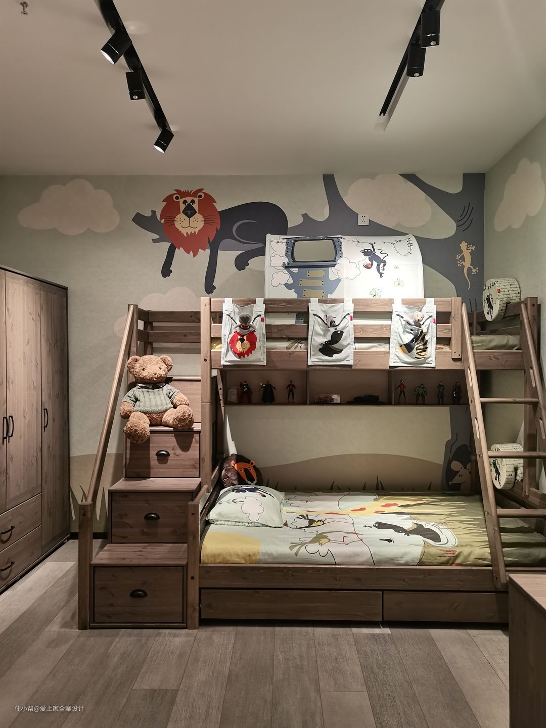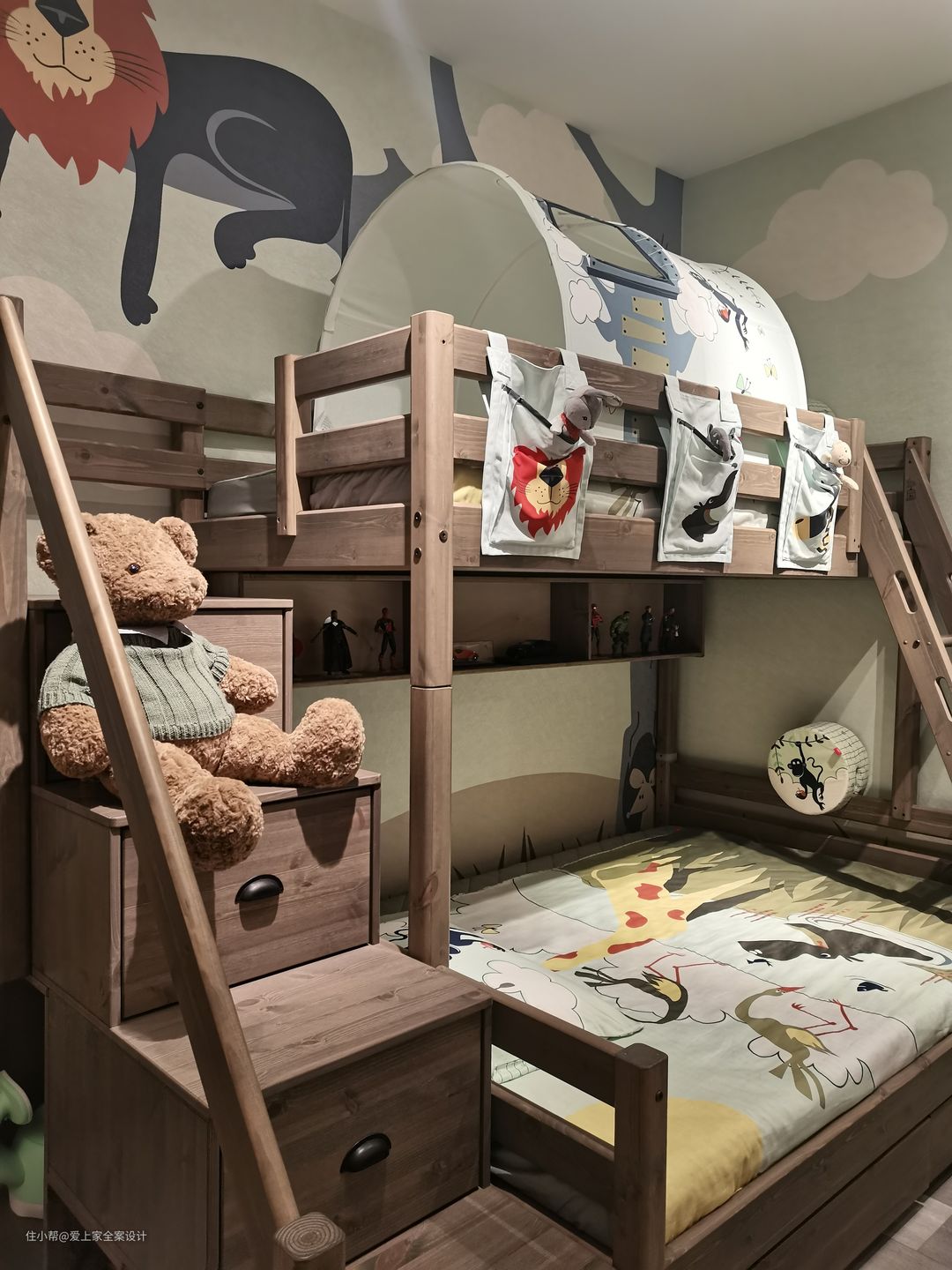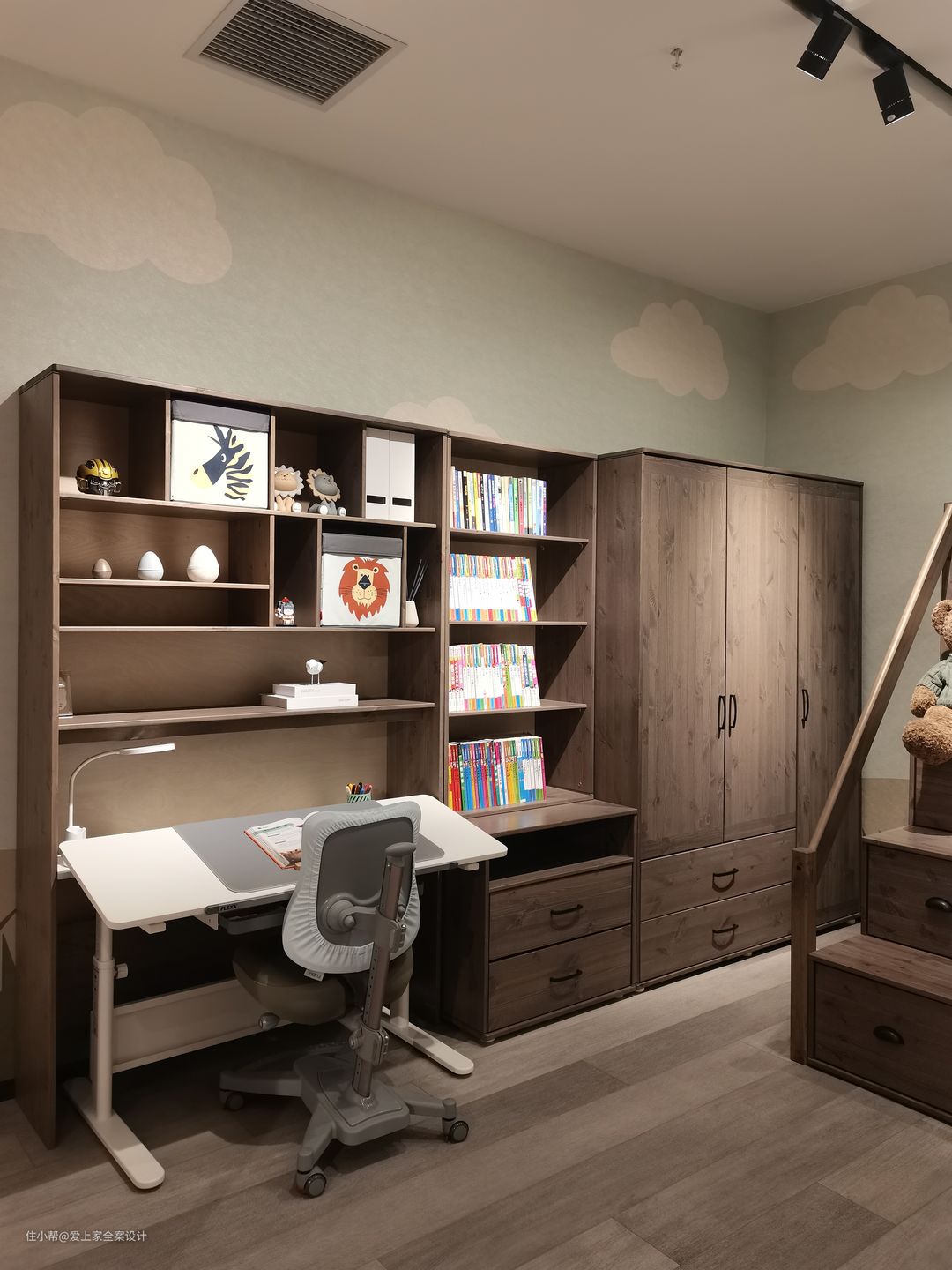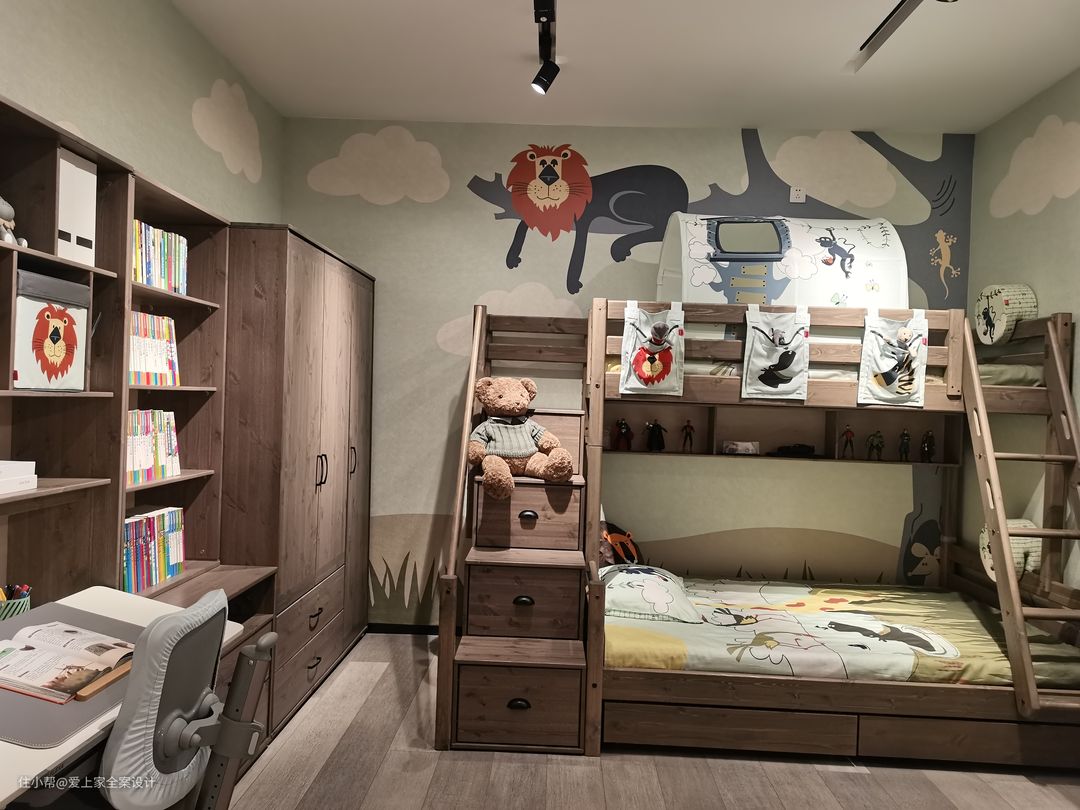步入儿童房,仿佛步入童话森林,这里有冒险家的小帐篷,有上下穿梭的玩具床,还有森林动物陪伴着家中宝贝。 在这个小小的儿童房,充满着父母的期待与爱。 我们保留了孩子童真爱玩的天性,也提供给他学习长大的小小一隅。