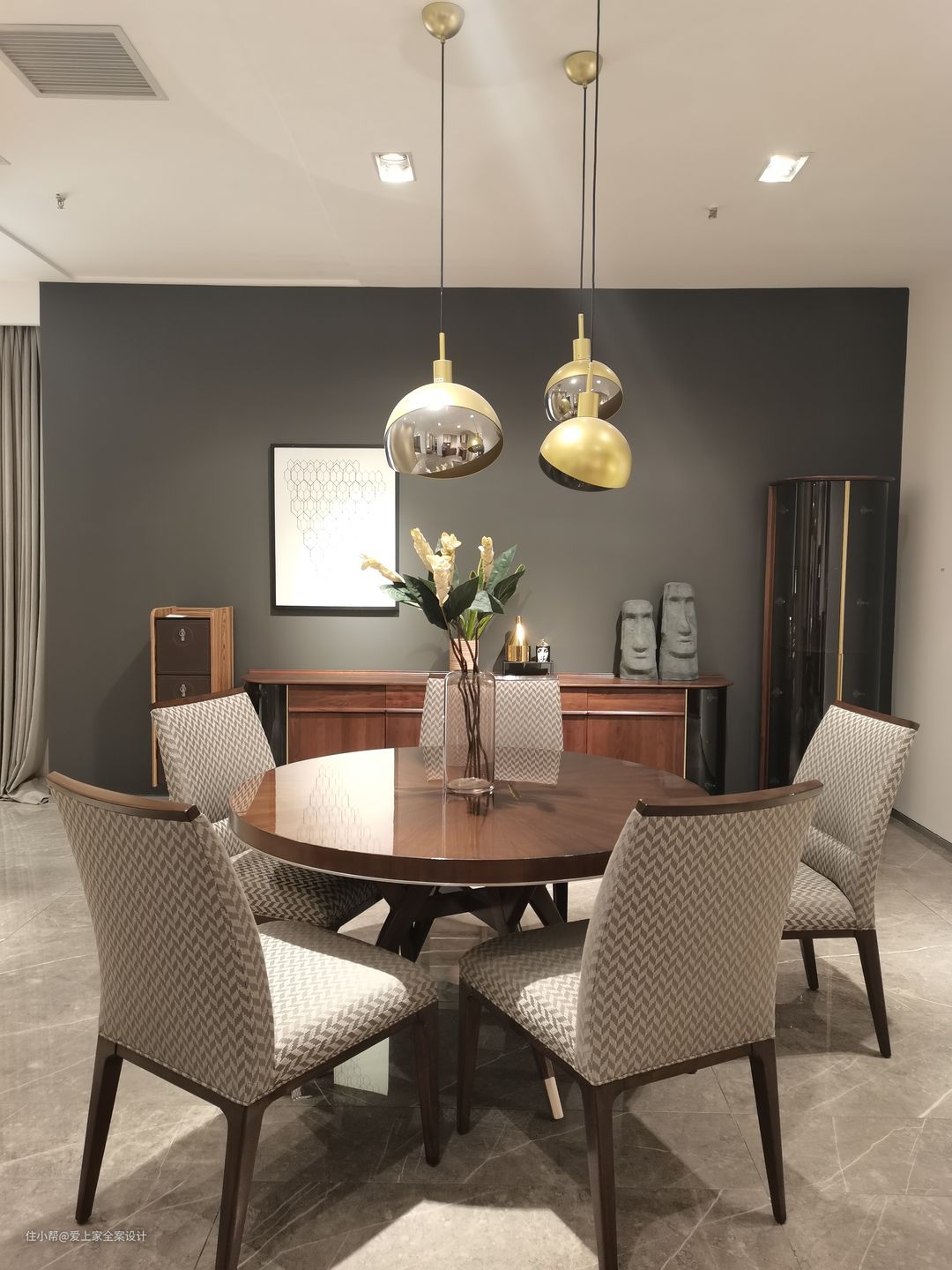 餐厅背景墙与客厅墙面使用同色涂料,保持客厅的精致感受。 圆桌对话意味着平等、协商,业主夫妇事业有成,非常看中与孩子沟通的机会。也希望自己的宝贝能自信勇敢的表达自己。因此选择了这样的木质圆桌,方便一家人进行交流。
