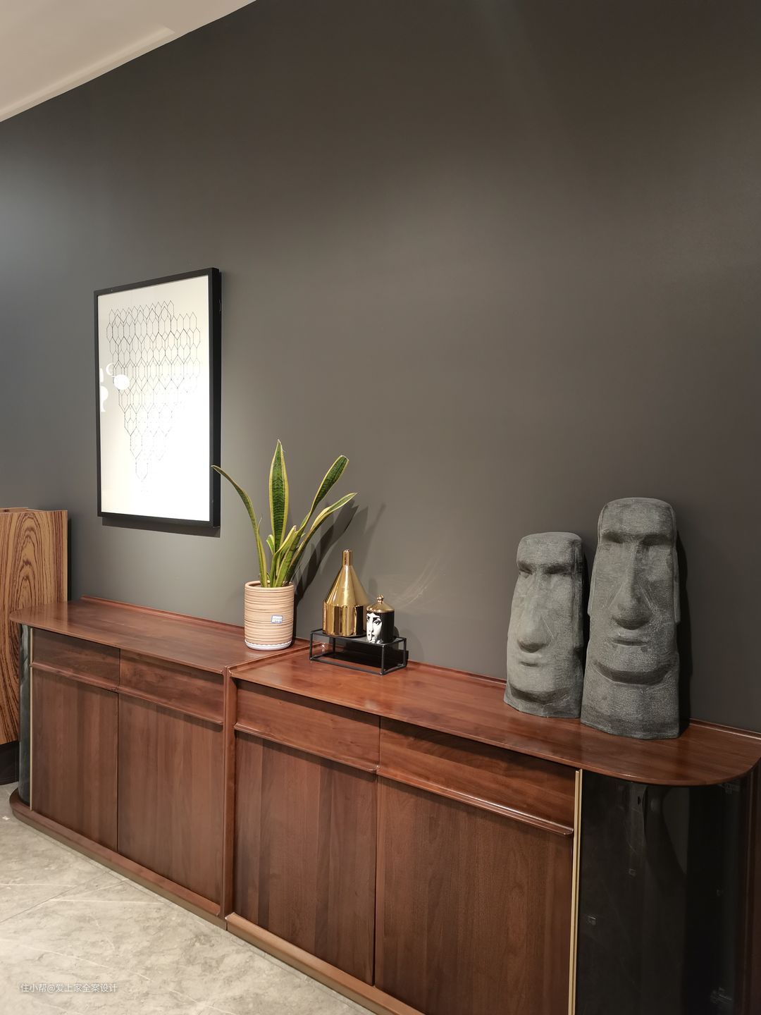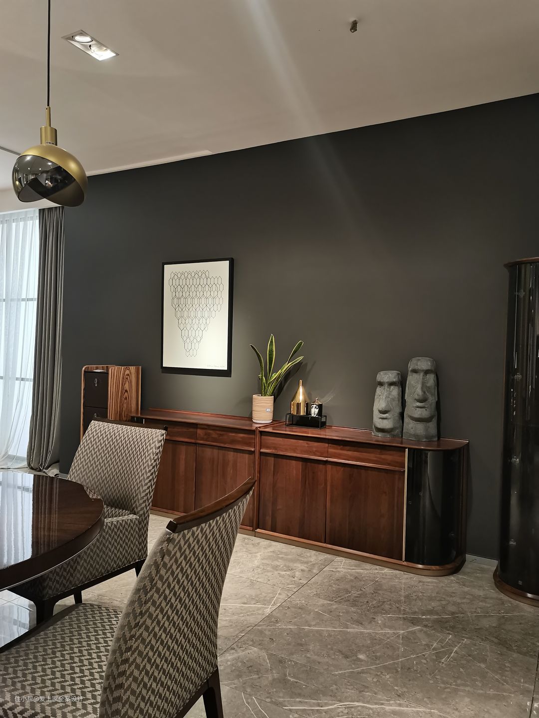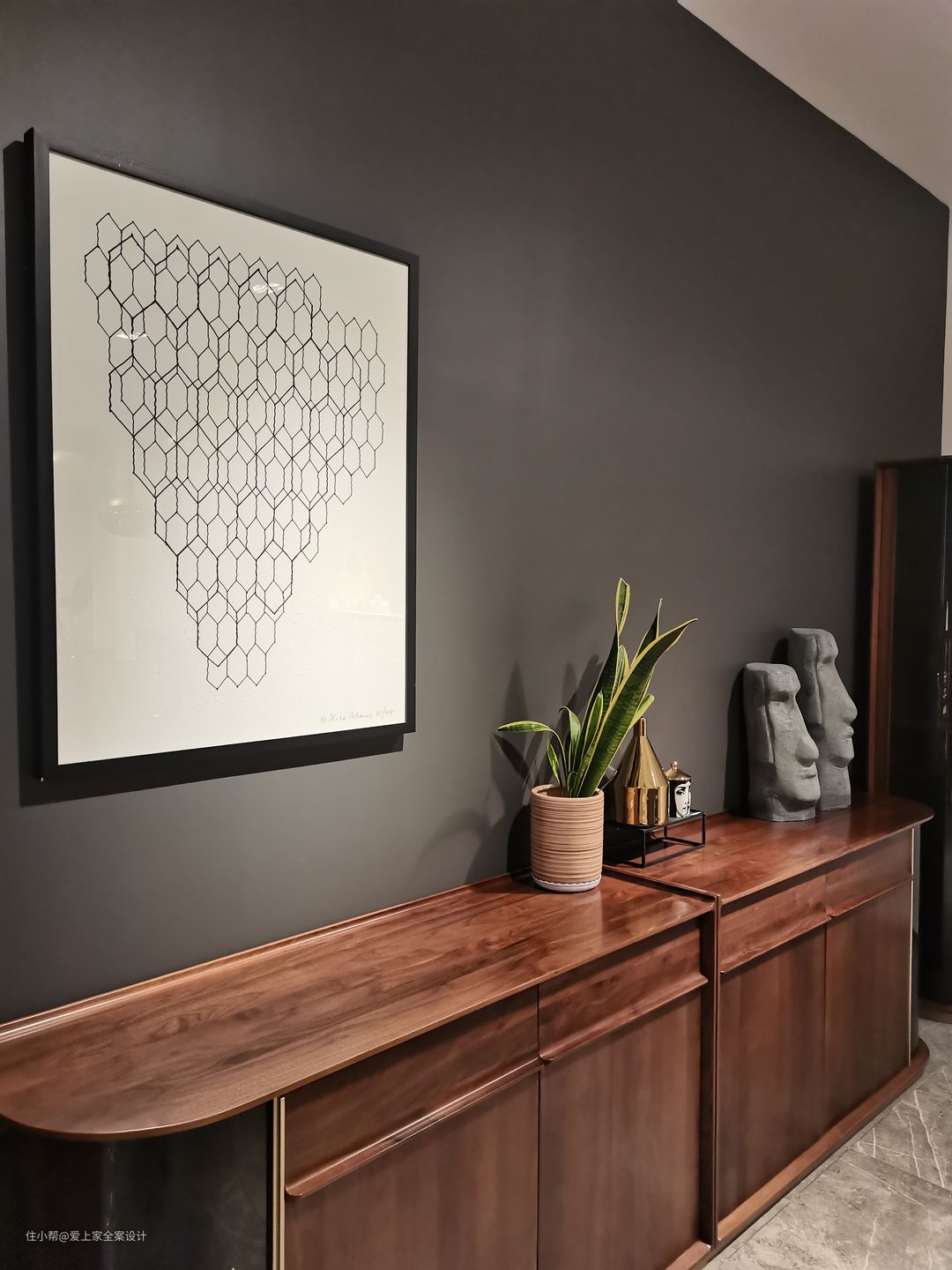 餐边柜增加了一部分的收纳空间,但我们也不希望,这个屋子的所有设计都围绕“功能、实用”。家应该有体现美和艺术感的地方。于是这样的餐边柜便在此出现了。