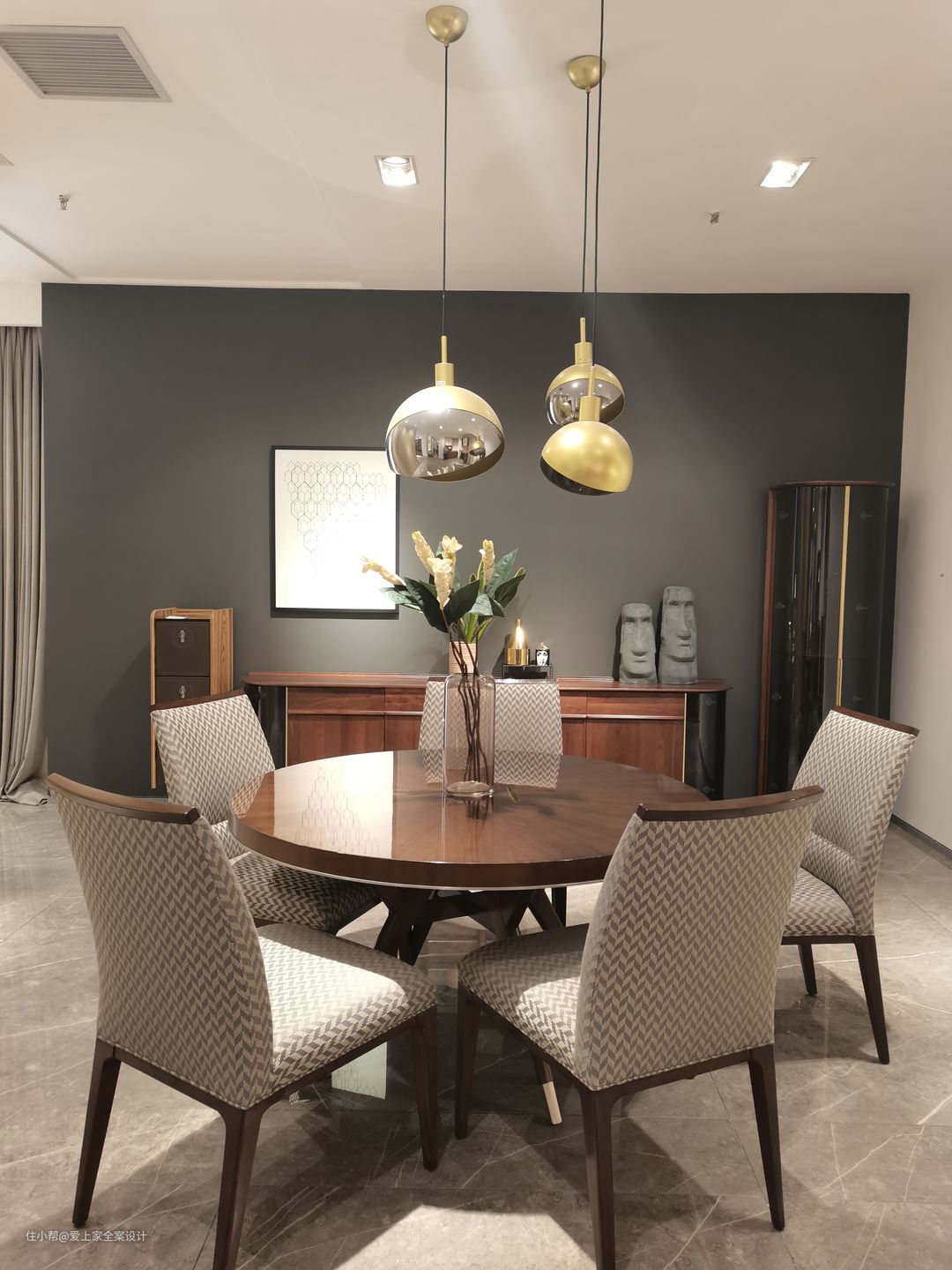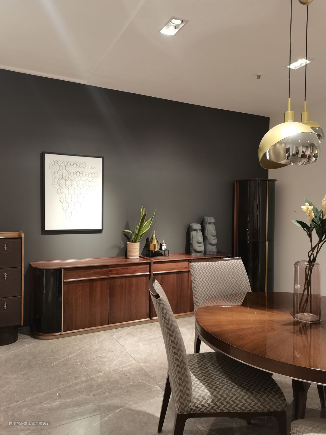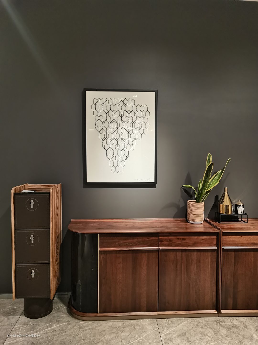 餐边柜增加了一部分的收纳空间,但我们也不希望,这个屋子的所有设计都围绕“功能、实用”。家应该有体现美和艺术感的地方。于是这样的餐边柜便在此出现了。
