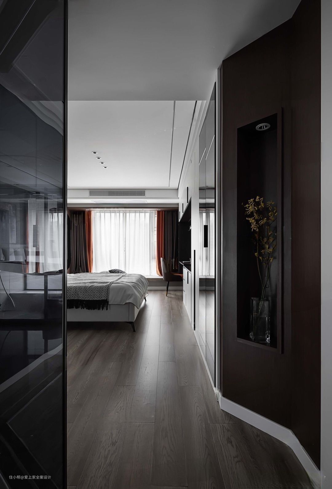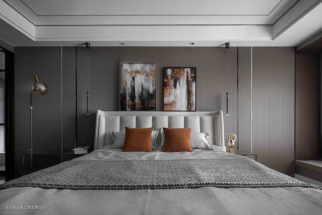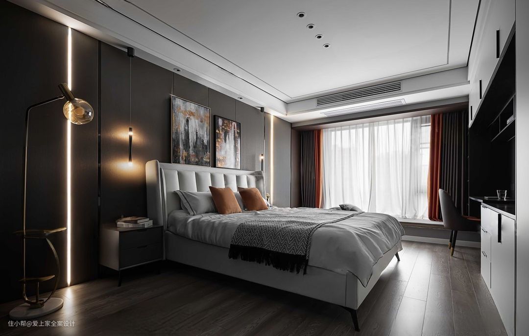 木饰面装饰的床头背景墙除了整体空间的一致性,也担负着氛围感的承载重任。 木饰面内藏的线性灯带,是氛围感的主力