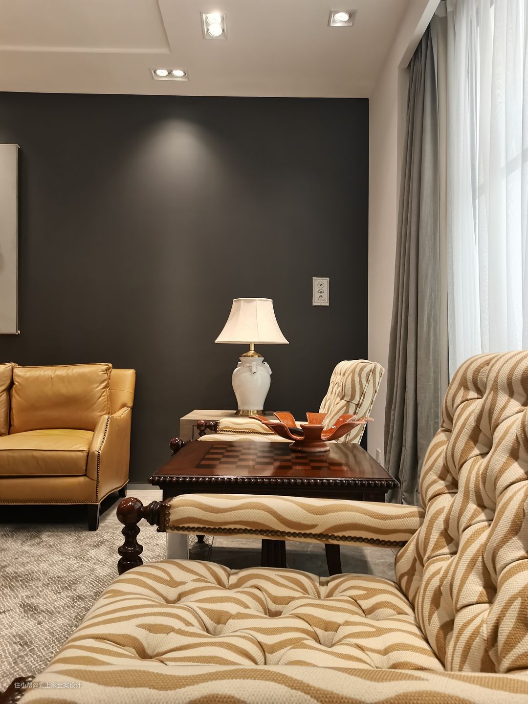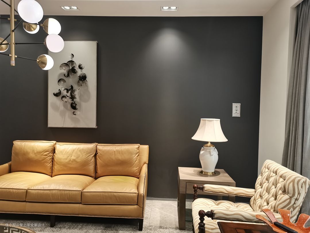 用黑色艺术漆涂料加挂画装饰沙发背景墙,与窗帘颜色相呼应,使空间色彩保持平衡,避免头重脚轻。 围合式的沙发布局不仅能满足一家三口的使用需求,在客人到访,共坐聊天时,也给了彼此面对面交流的机会,促进亲情、友情的交流。