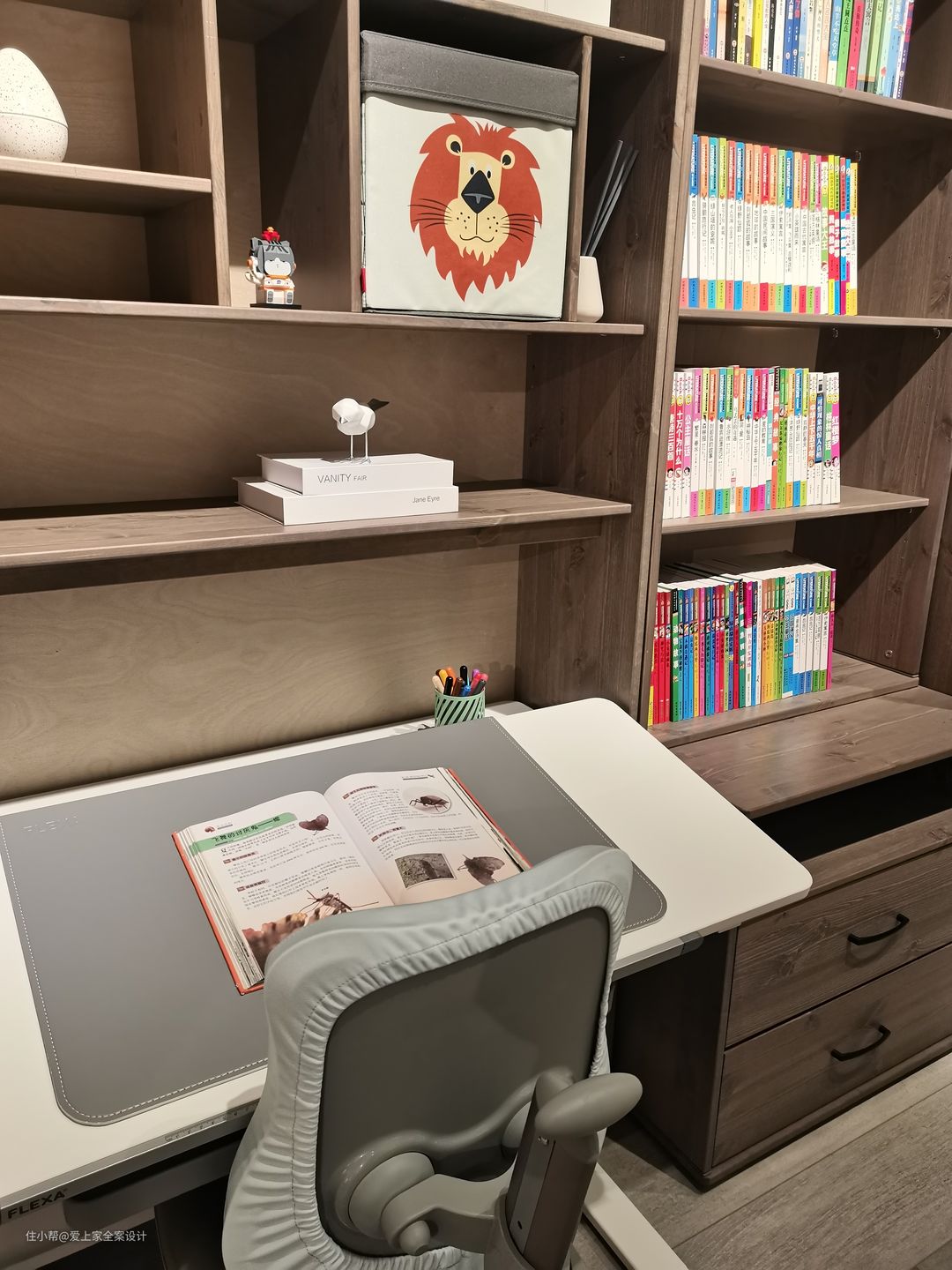 楼梯踏步由一个个抽屉组成,这里可以藏他的玩具,也能存放不再阅读的儿时读物。