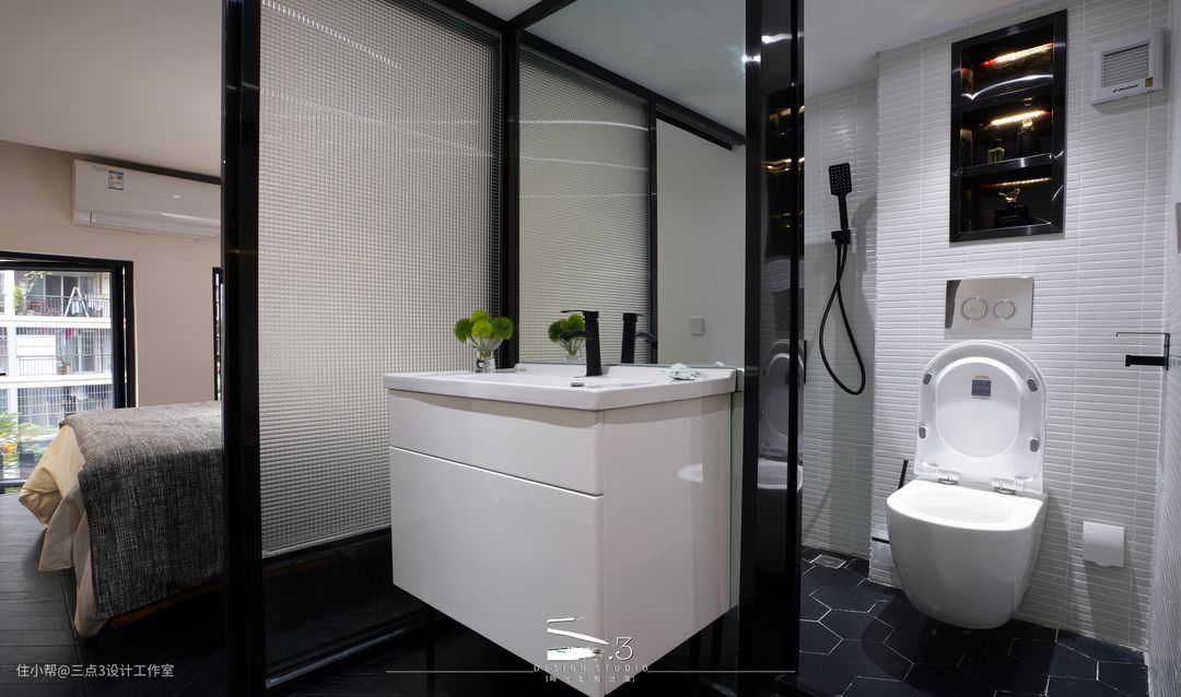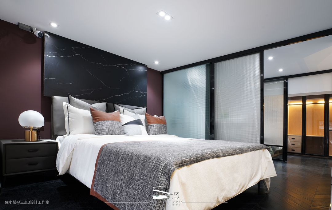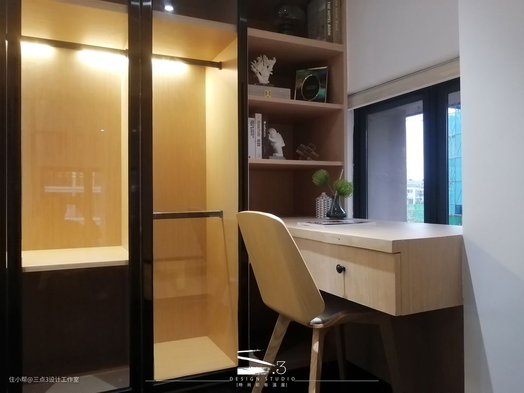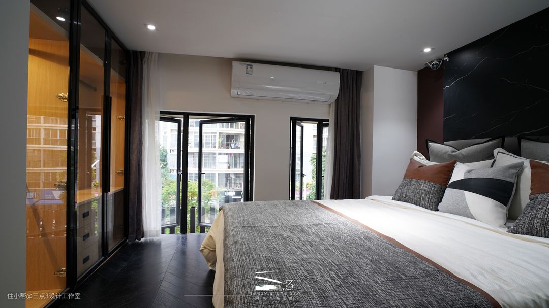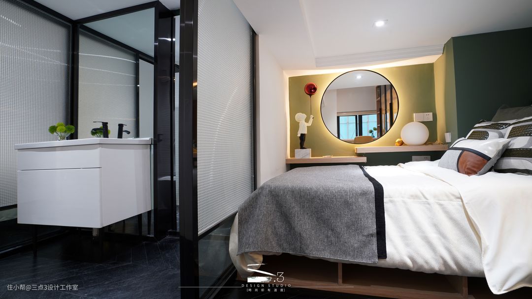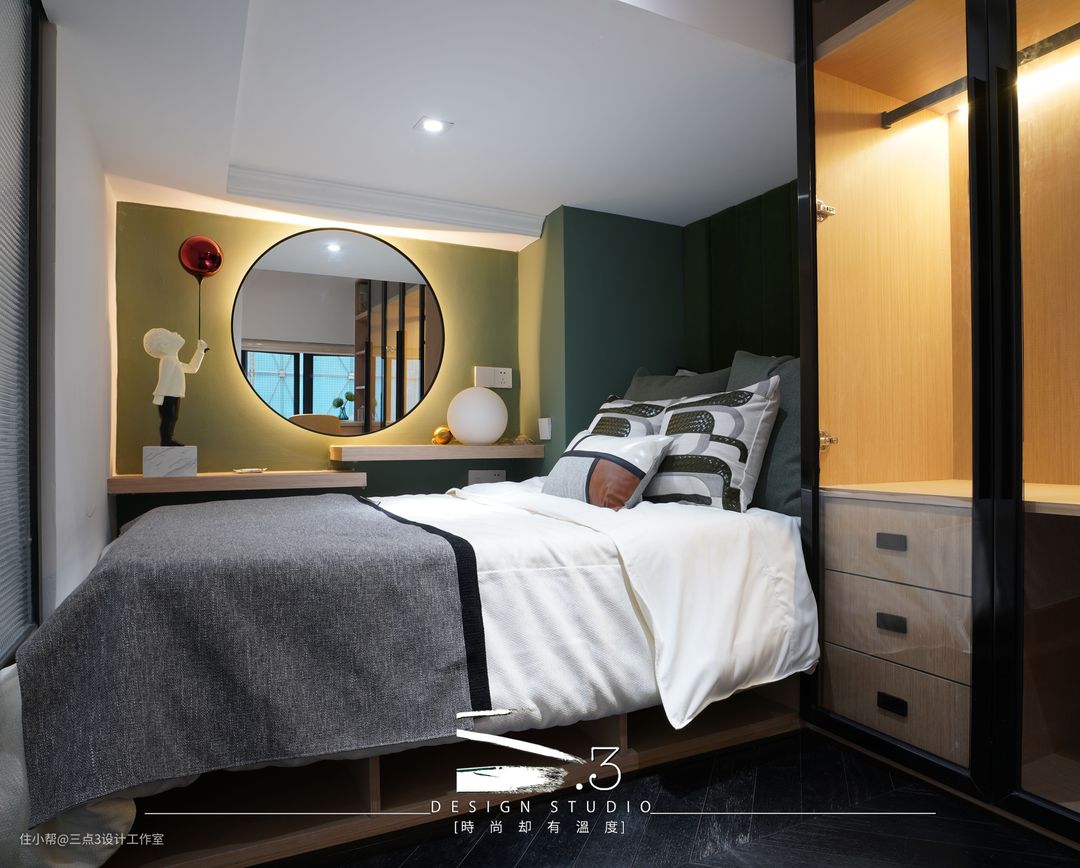 二层双睡房中间用厕所分隔开来,隔断都采用长虹玻璃隔断形式,使房间自然光线充足; 两个房间都有足够的收纳空间:衣柜、书柜、书桌应有尽有,可谓是“麻雀虽小,五脏俱全”