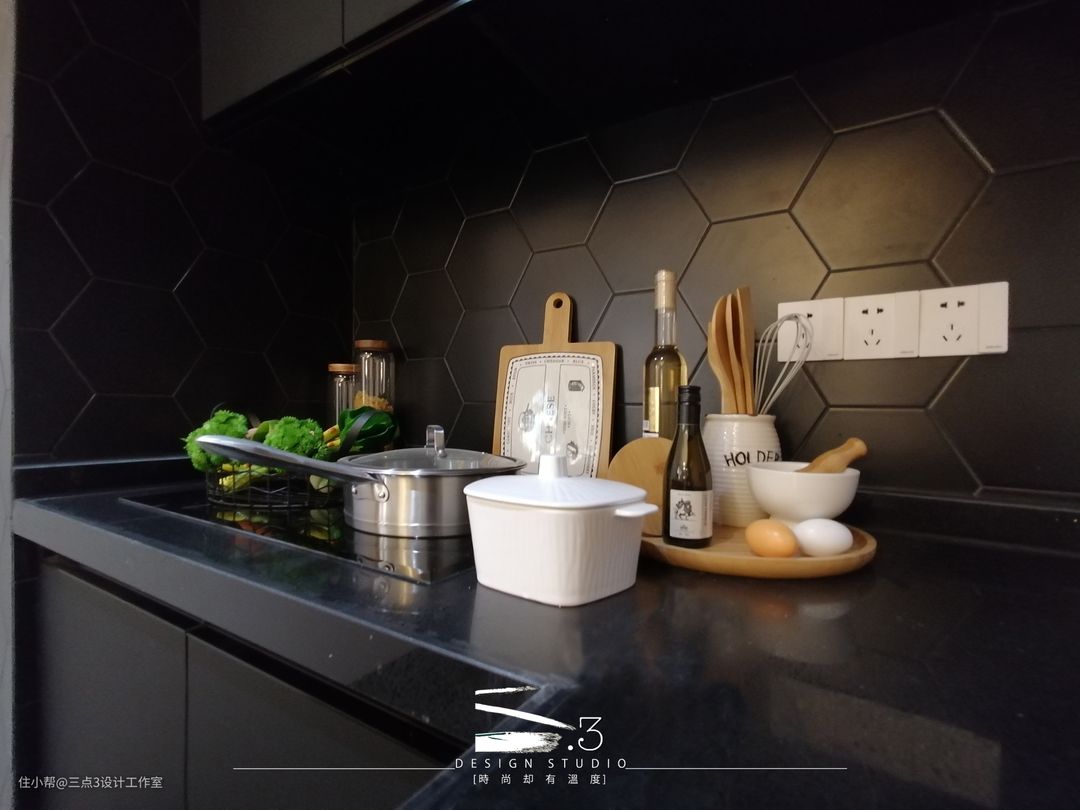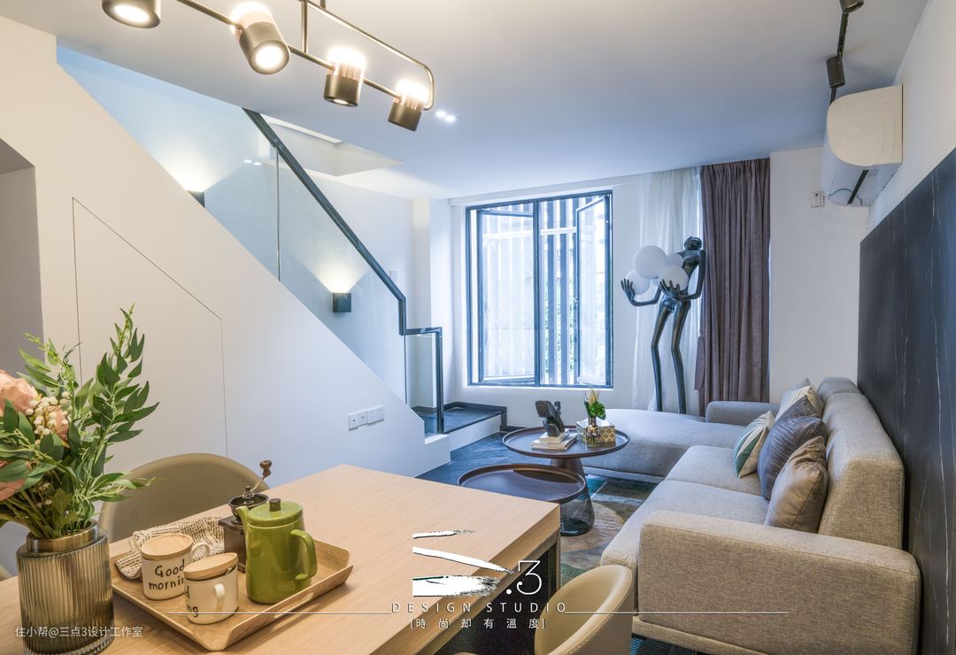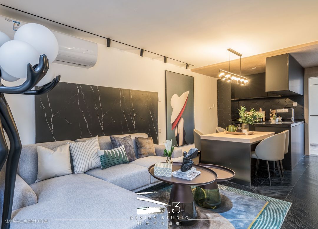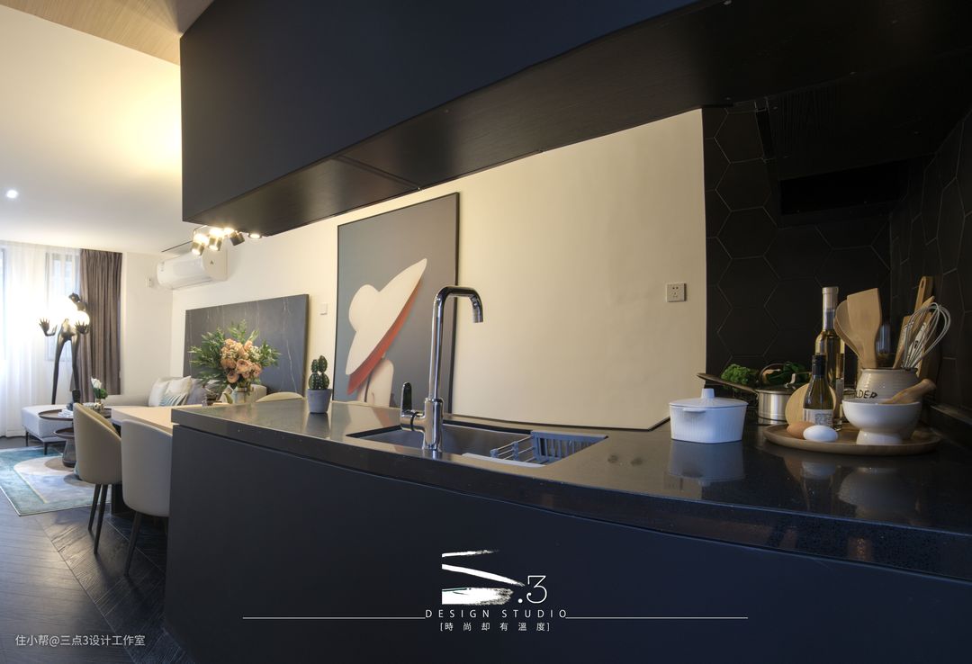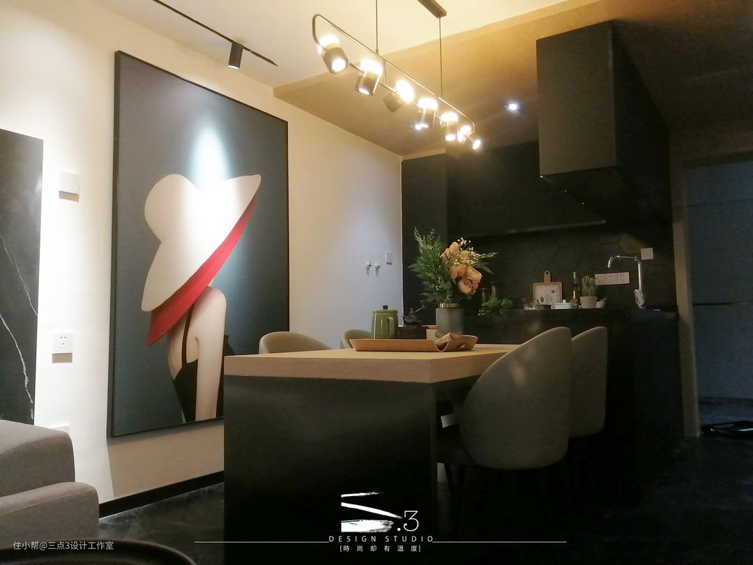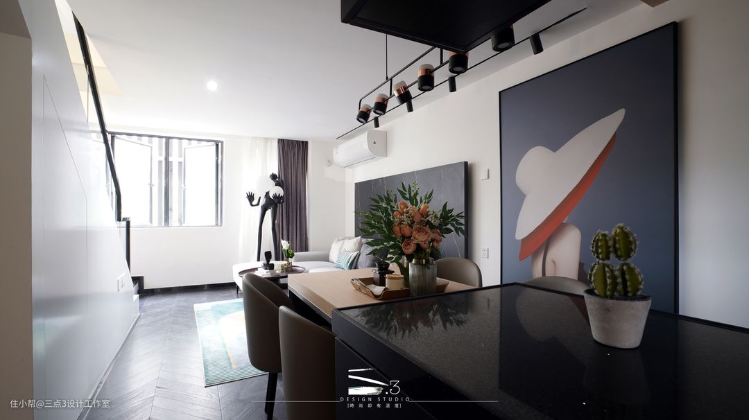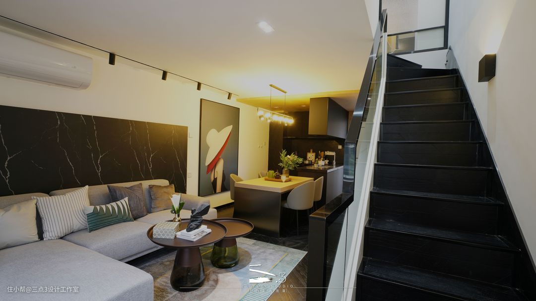 一层的所有空间设定为公共活动空间的范围:入户、厨房及客餐厅;现代简约轻奢风,黑白色调混合木色做点缀;入户空间采用了木饰面吊顶,通过吊顶材质的不同来简易区分了入户及客餐厅的区域,给了入户一点仪式感,全开放式的厨房连接餐桌及沙发区域,就算三五知己节假日在家聚餐也不会拥挤,贴切年轻人的生活模式; 另外楼梯底部做成收纳空间,实用的同时又能减少空间的压迫感。