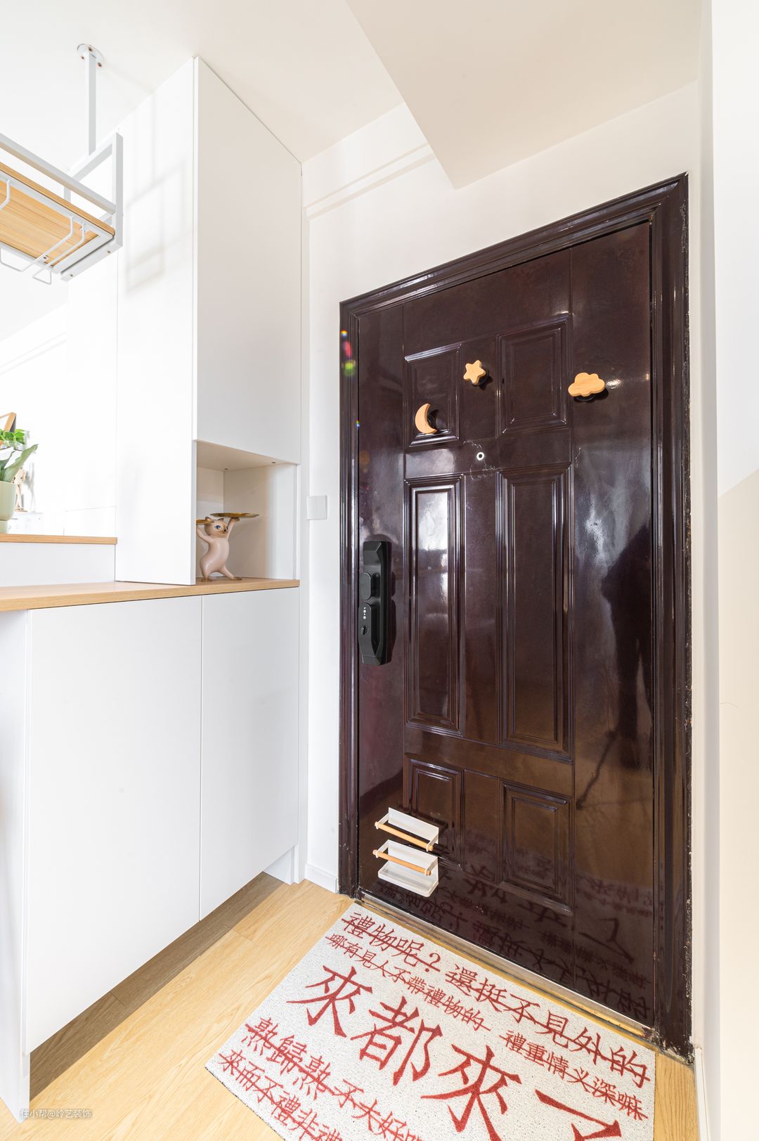 为了尽可能的增加收纳,在面向厨房的一侧,购买了成品的超薄鞋柜,18cm的厚度完全不影响过道的通行