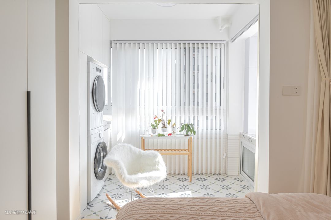 原来放置在北阳台的洗衣机规划到了南面阳台,搭配小花砖与梦幻窗帘,让这个家政区更像是一个休闲空间