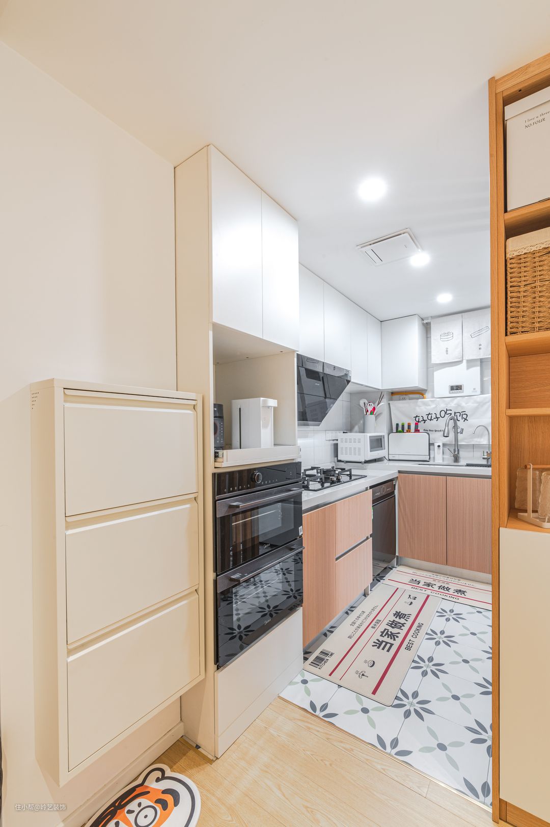 不知道大家有没有注意到,本案的地毯都是屋主自己挑选,幽默的话语让整个家都洋溢着欢笑与童趣,厨房地面采用300*300mm的小花砖,墙面与吊柜都采用白色,尽可能让空间更明亮通透