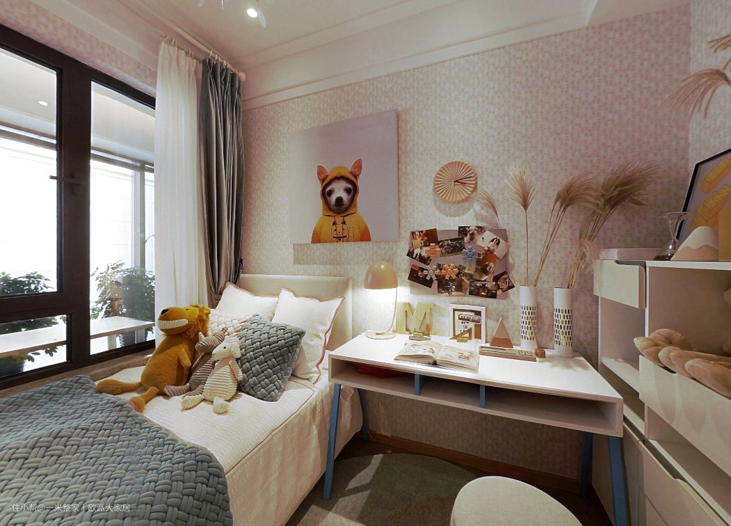 儿童房的家居以白色为主调,灰色床尾毯搭配相同的抱枕,加上玩偶的摆放,让原本白色的床不简单。书桌加抽屉的方式,便于摆放更多书本。右边的收纳柜简洁同时,可放置大大小小的物品。墙布以多个波点组成,代替了传统的白墙,视觉上更美观。桌面的小台灯,让孩子更好的学习。