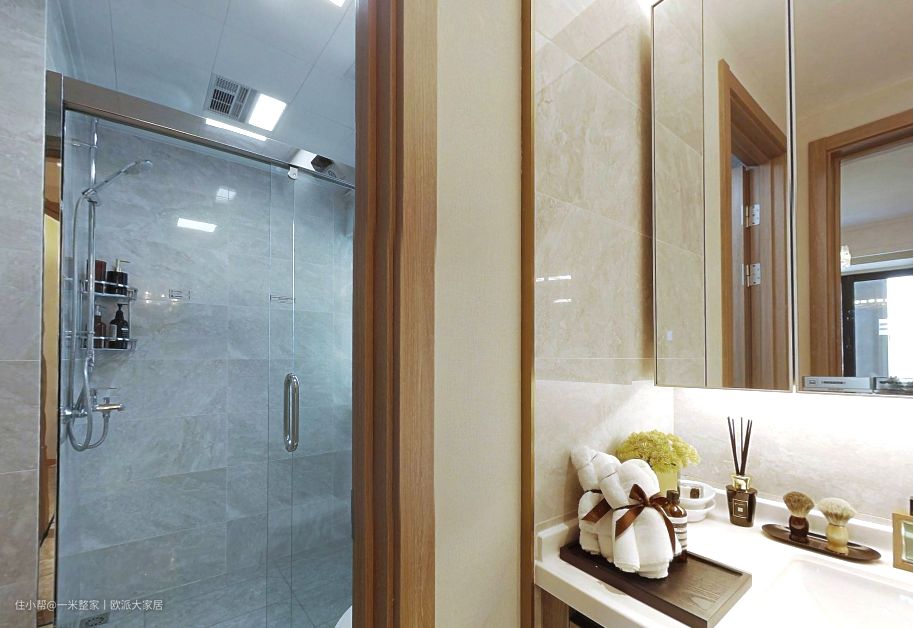 洗手台的位置与马桶、淋浴区隔开,解决了日常多人对洗手的需求。采用干湿分离的设计,不会让整个地面处于湿的状态,淋浴区的墙角位置安装置物架,方便摆放各种生活用品。镜面与柜子的结合,更方便生活。柜后的灯光安置,见光不见灯的感觉,高级感十足。