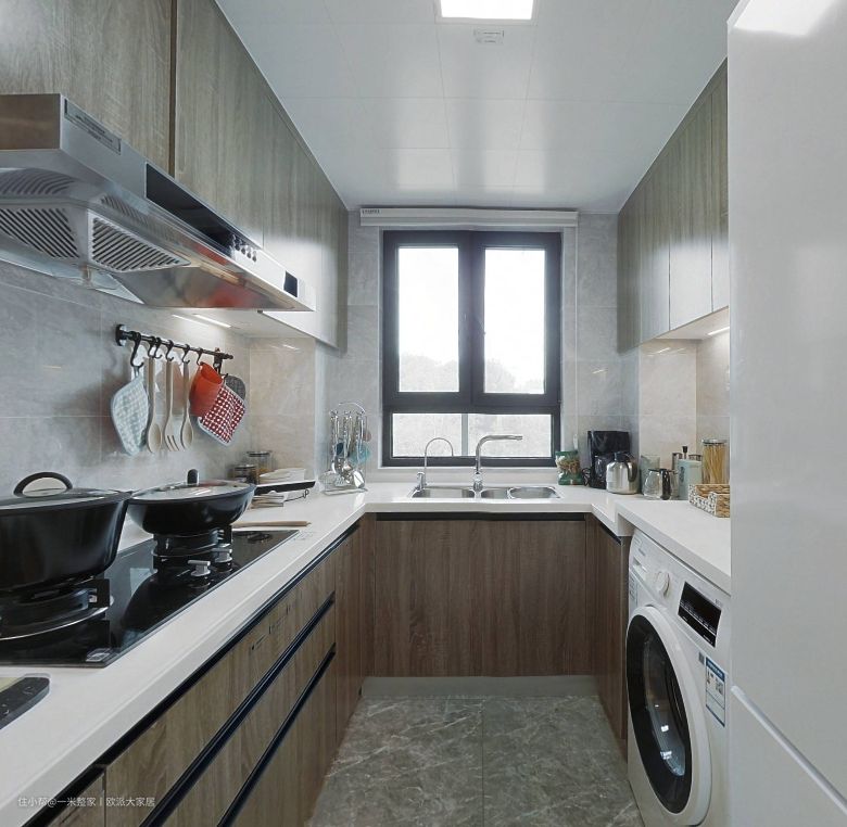 深原木系的橱柜,简洁且耐脏,容易打理。U型的格局布置,让走动的空间更多,更方便烹饪。浅灰与白色结合的墙面,整洁大方,也不会让厨房环境昏暗。利用一部分位置放置滚筒洗衣机,完美的空间利用。墙上安装一排挂钩,方便摆放各种厨具用品。