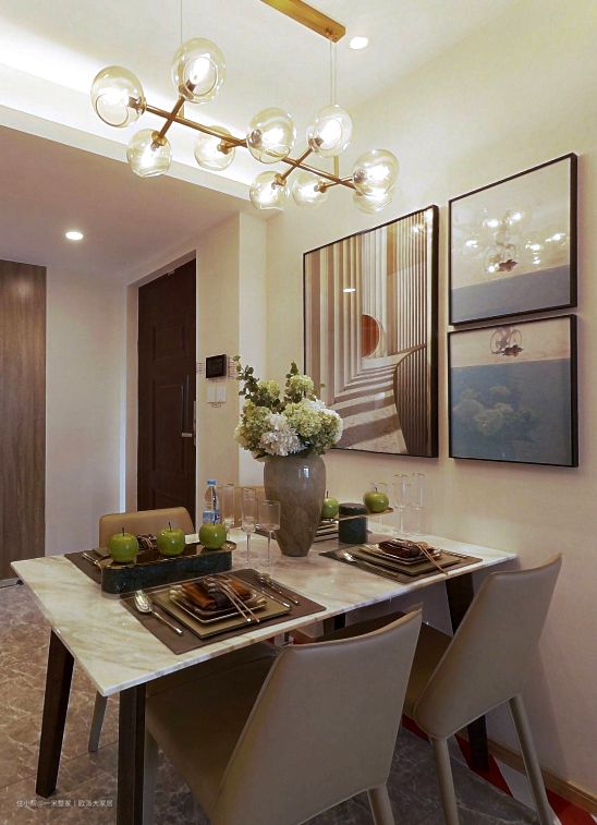 餐桌椅的设计简约,搭配相同风格的餐具,使得餐桌面不单调。壁画线条流畅,不会采用过于浮夸复杂的设计。吊灯以灯泡的形状呈现,美观且极具特色。