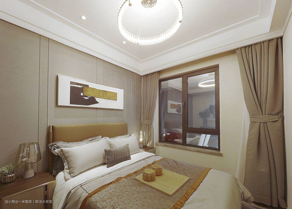 黄色和棕色结合的床尾巾,很好地丰富了床的颜色。白色圆环吊灯与天花吊顶互相映衬,褐色窗帘与窗户相结合,床头背景墙浅灰色的墙布设计,简约大方。