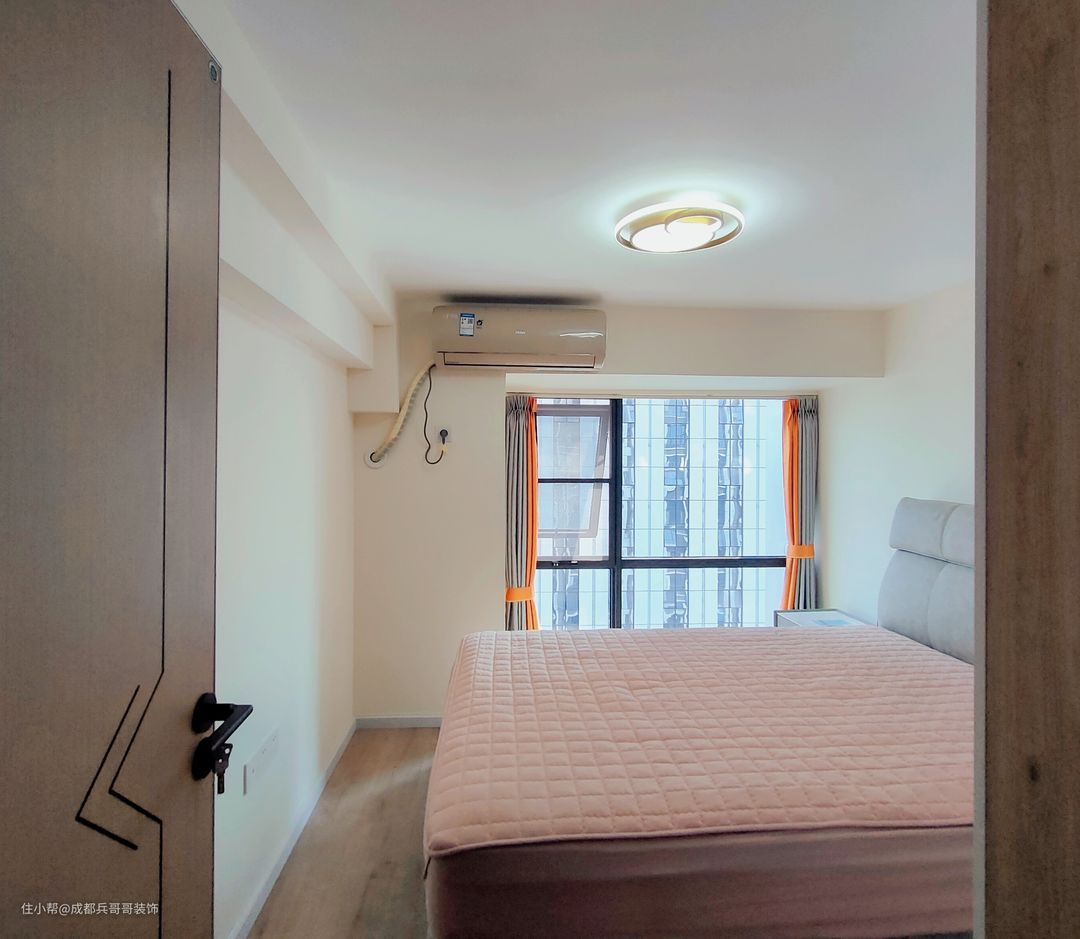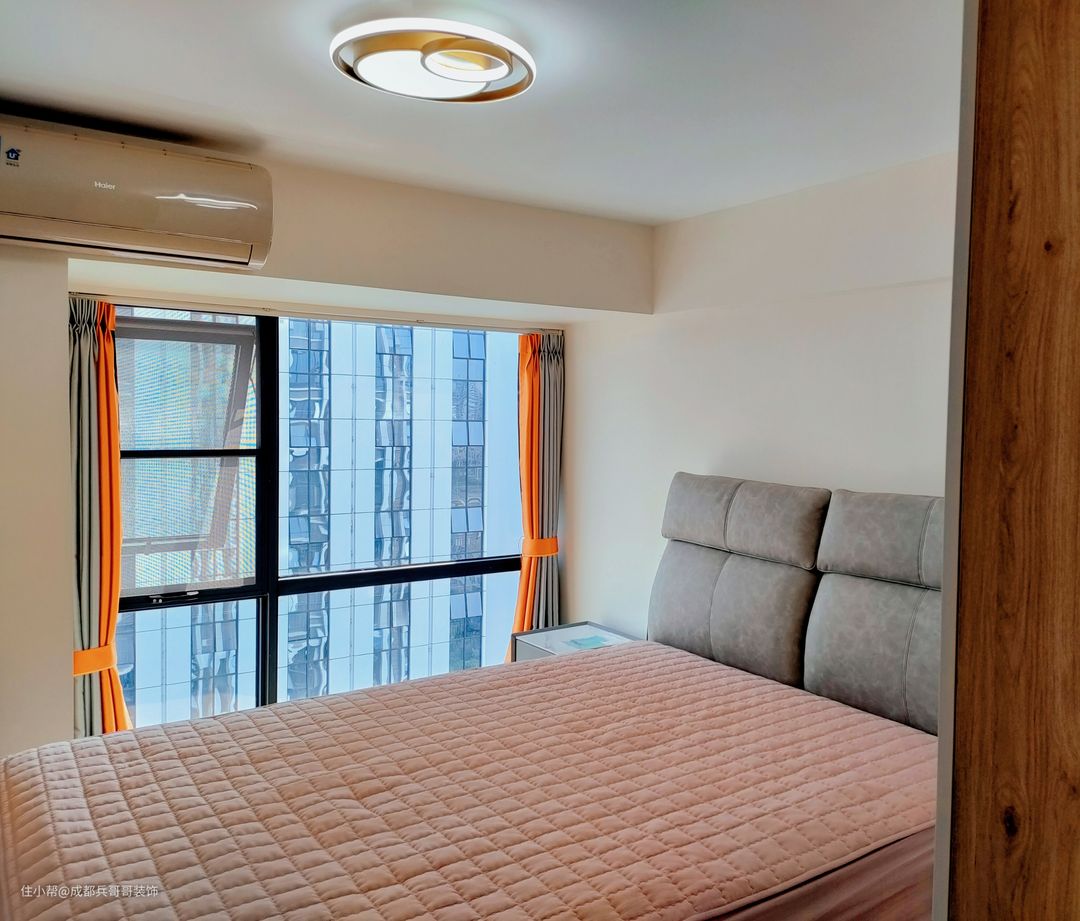 次卧也安排在二楼,空间足够,设计师巧妙设计了落地窗,为房间带来了充足的采光,通风效果也不错。整体色调和主卧保持一致,视觉上协调性更好。